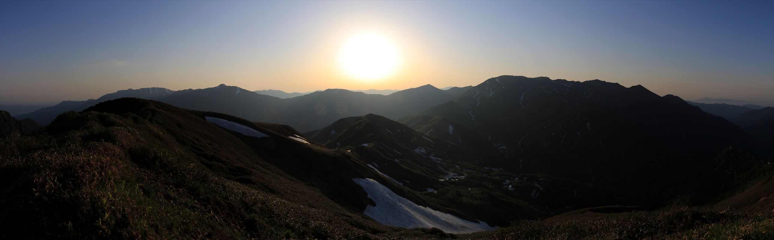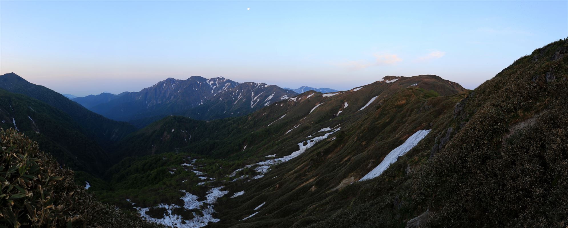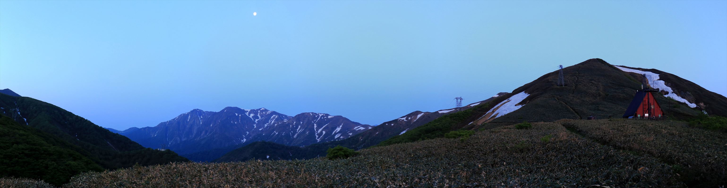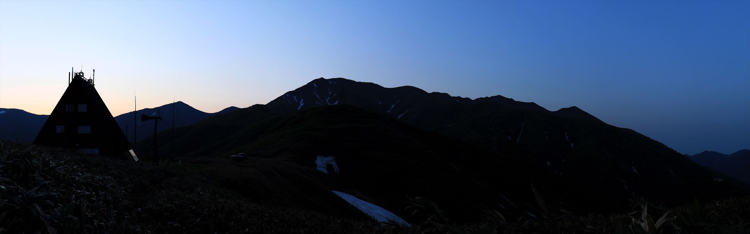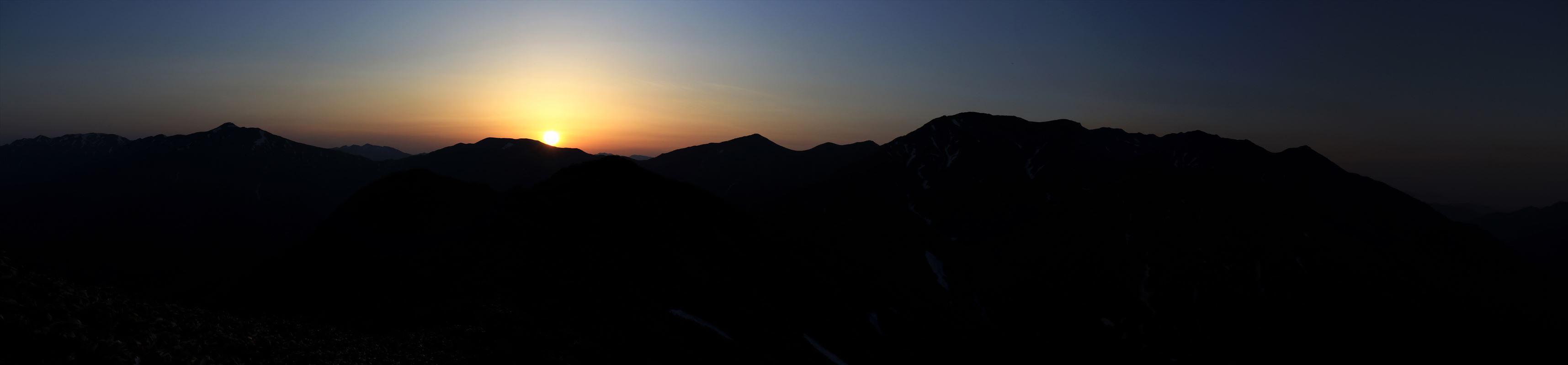 こちらは反対側、昨日歩いてきた朝日岳。まだ薄暗く写真にするとシルエット状態。