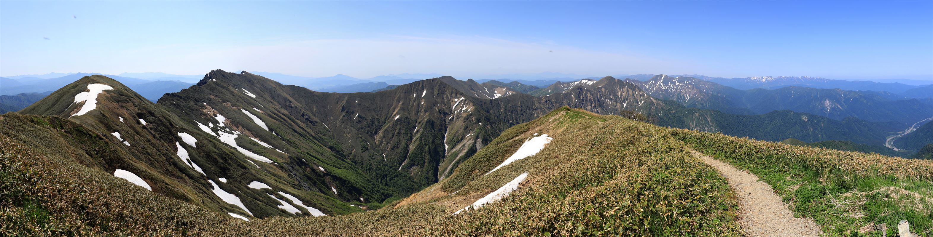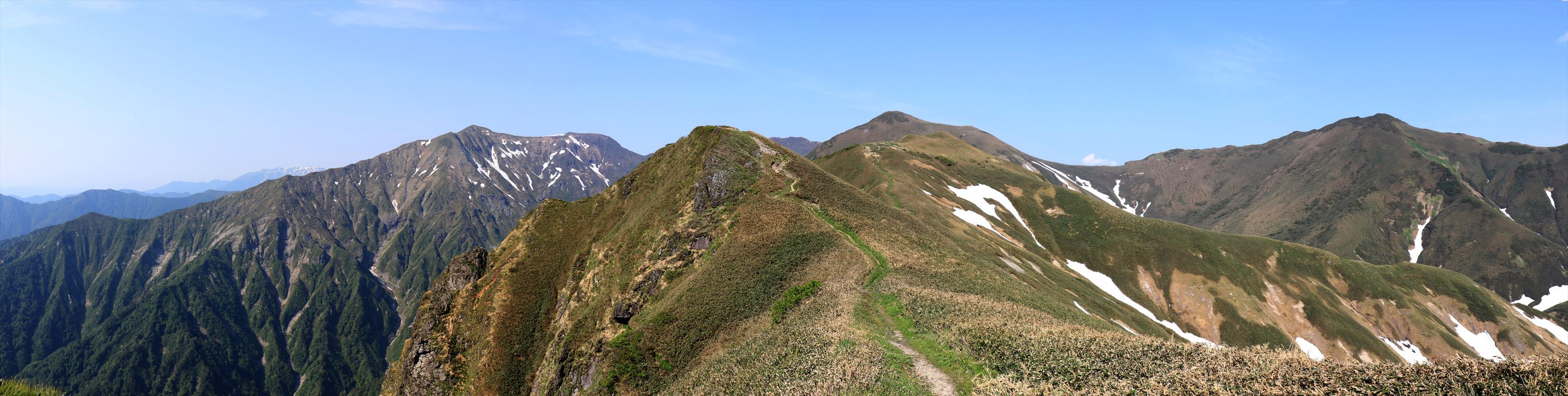 進む予定の縦走路。猛暑で水は残り1リットルくらいしかなくなり厳しいけど……残雪もまだ多い時期だからなんとかなるだろうという事で続行。目下は大障子避難小屋の水場を目指す。