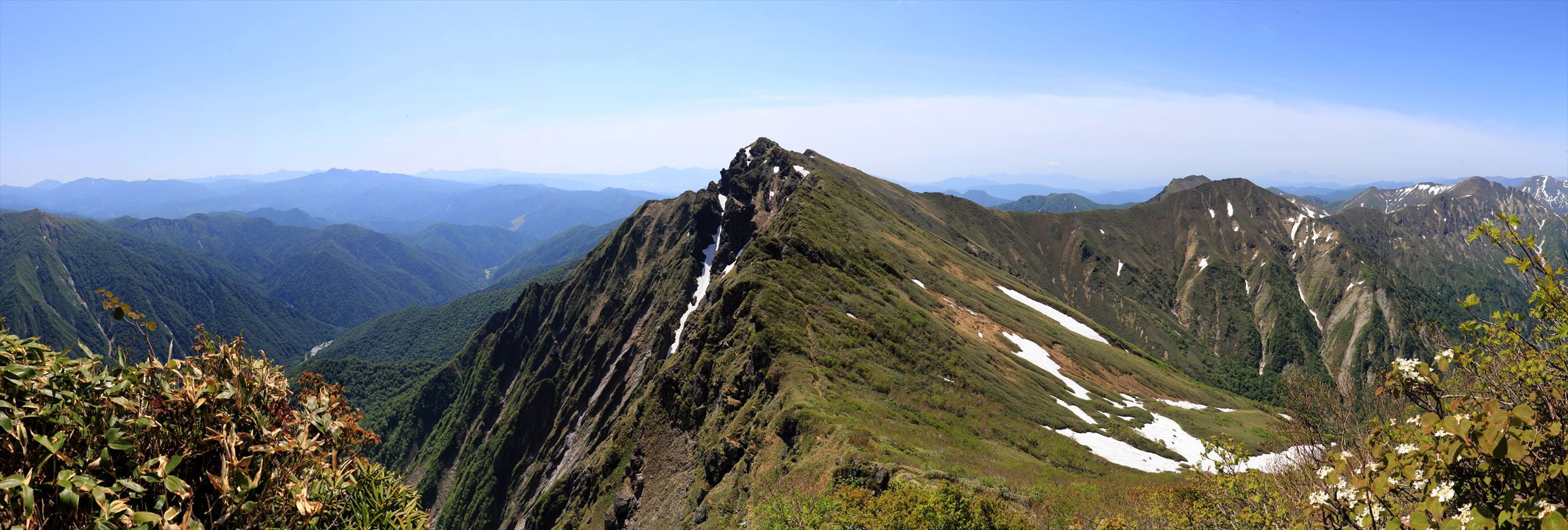 清水峠方面を望遠で。左に巻機山。中央奥に越後三山の中ノ岳が見える。その右には裏越後三山の荒沢岳……未踏だからいつか行きたいな。