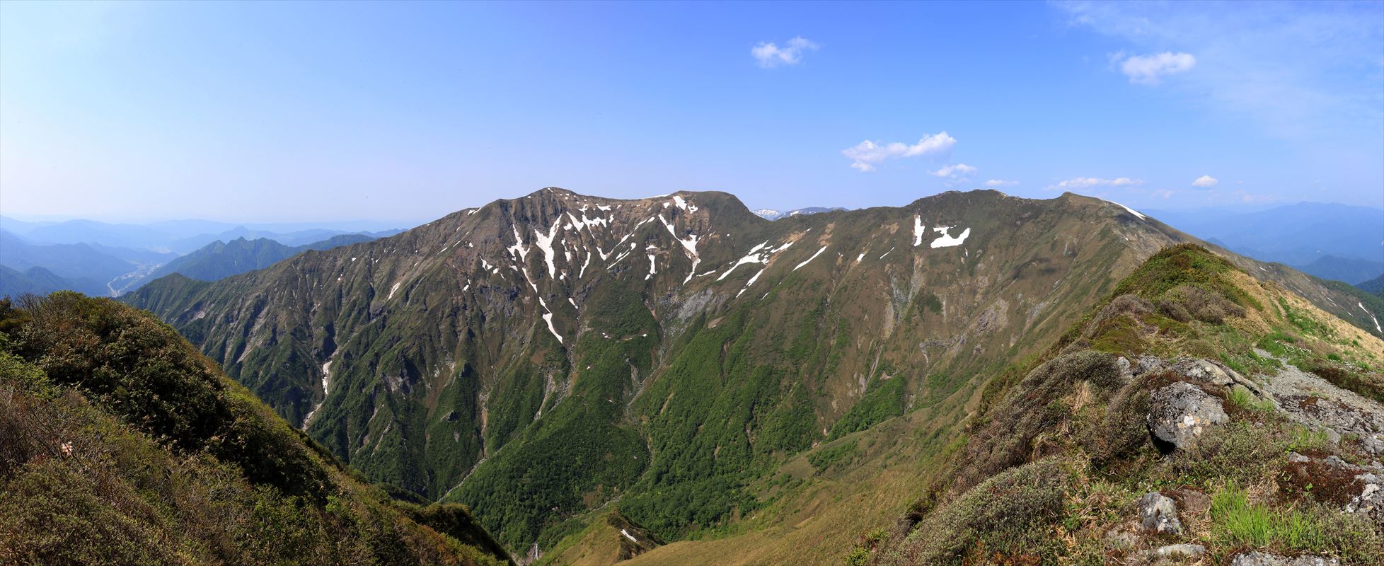 一ノ倉岳方面、途中に広がる残雪……雪の上で涼む人の姿が見える。右の写真は巻機山。