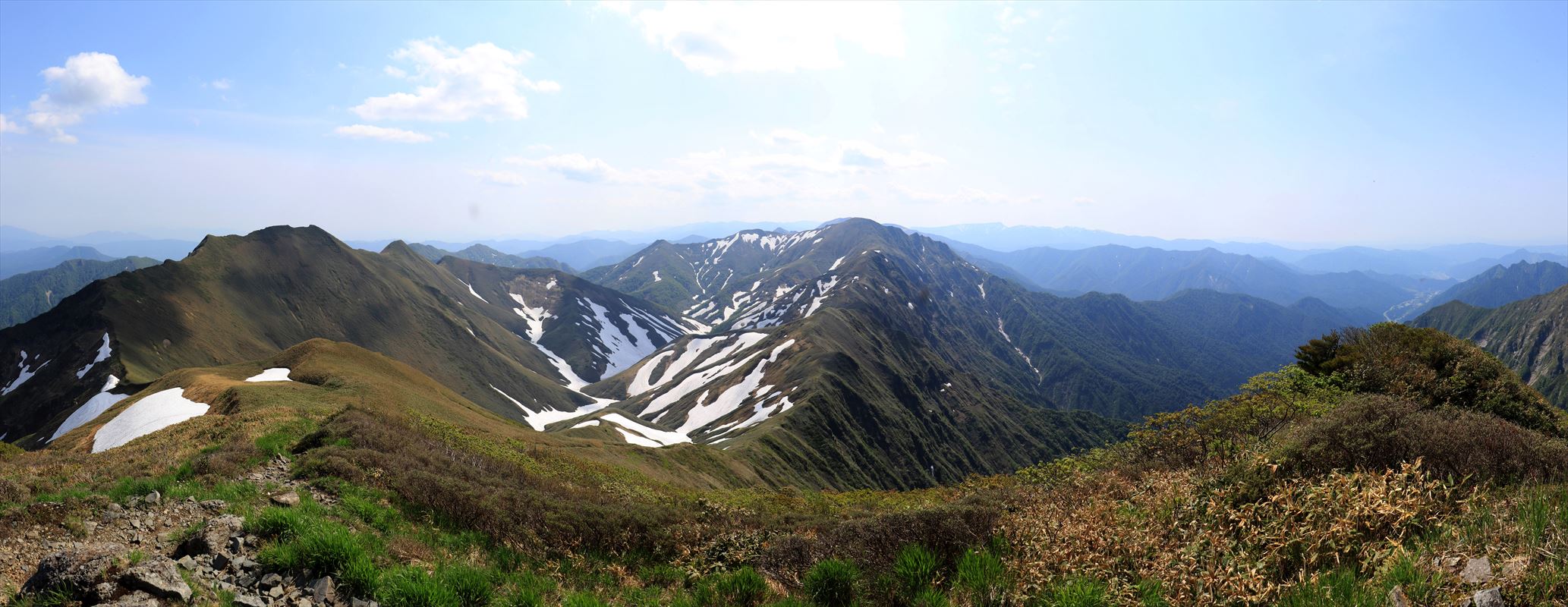 歩いてきた稜線と朝日岳、清水峠、巻機山方面。尖った大源太山が低いながらも中々の存在感。