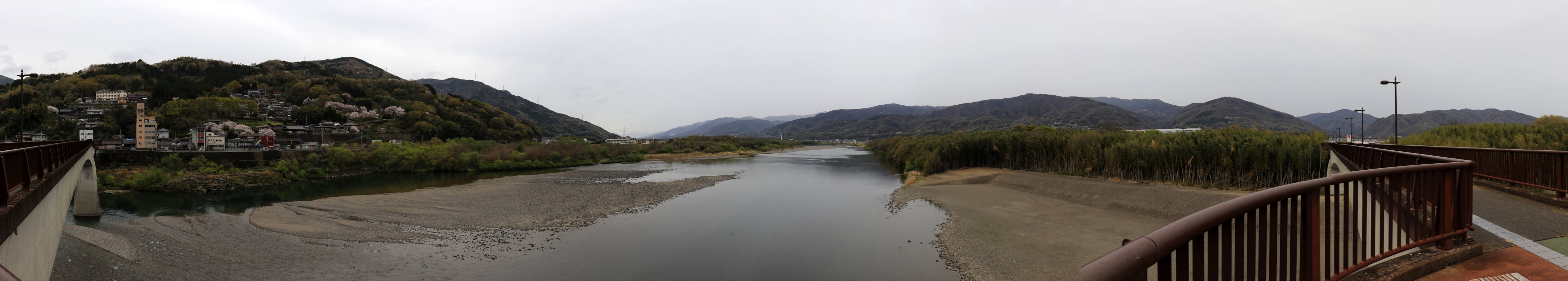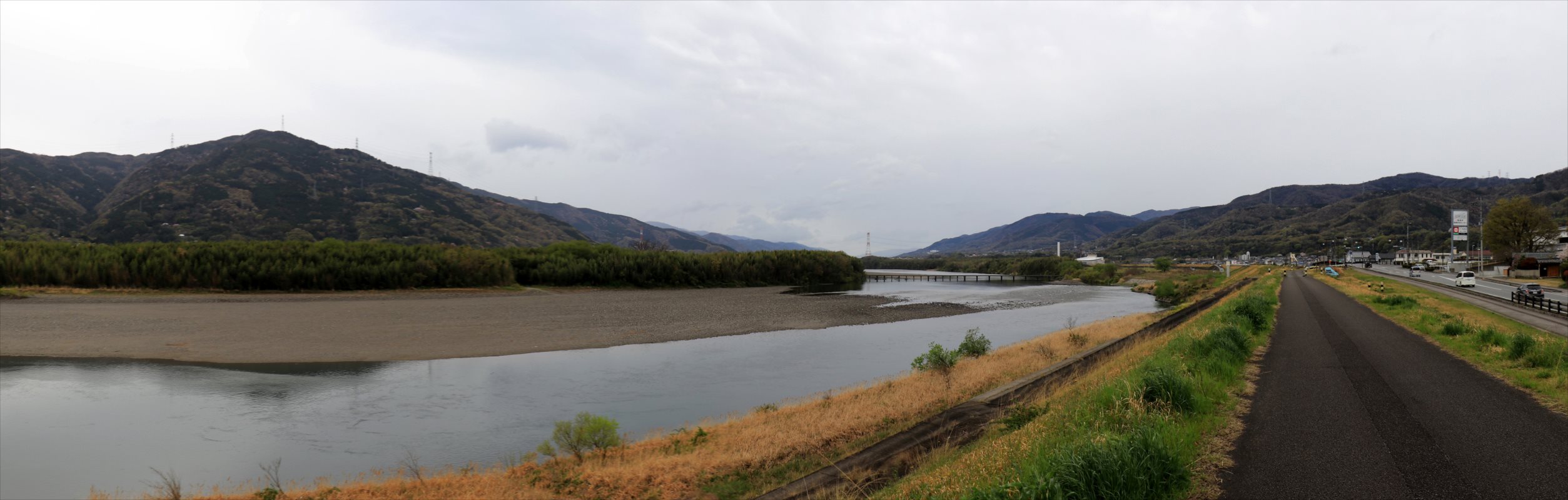 橋の上からの吉野川。全長こそ四国最長の四万十川に僅かに及びませんが、流域面積は遥かにそれを越えるので実質的には四国最大の河川とも言えます。川幅も相応に広く、この付近は河口から40km遡った地点であるものの対岸まで650m、徒歩で10分掛かる