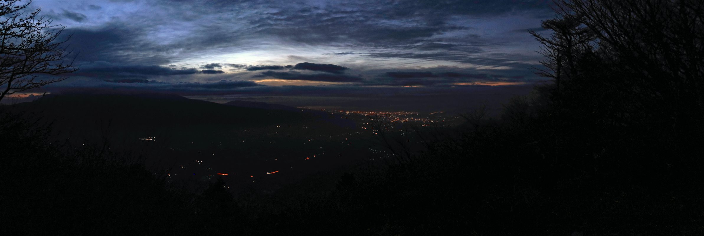 毛無山の山頂近くにて、未明に外を覗いてみるといい感じの街明かりが……初日に身延線で移動した富士宮から富士に掛けての市街地でしょうか。三脚持参で来たので暫く夜景を撮ったりして遊んでいました。