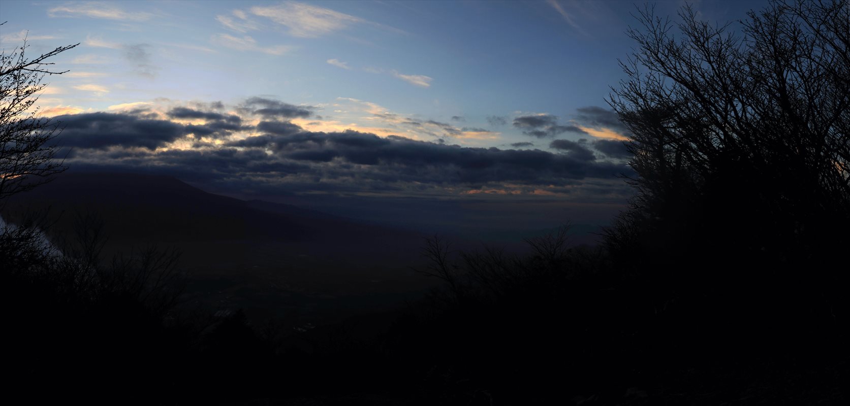 日の出が近付いてきて次第に明るくなってきた頃。日の出そのものは見えないであろう雲の量で、左に見える富士山も山頂の方は完全に埋もれている。