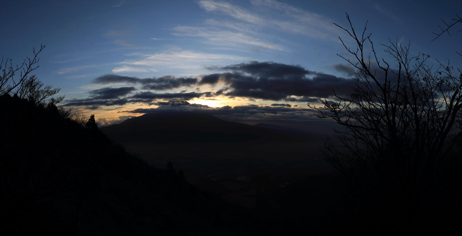 ずっと鬱蒼とした道が続くのかと思いきや、すぐに開けた所に出ました。見える富士山も日の出が後光となって神々しい。
