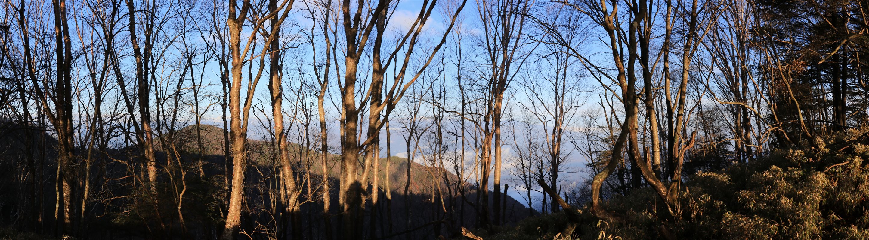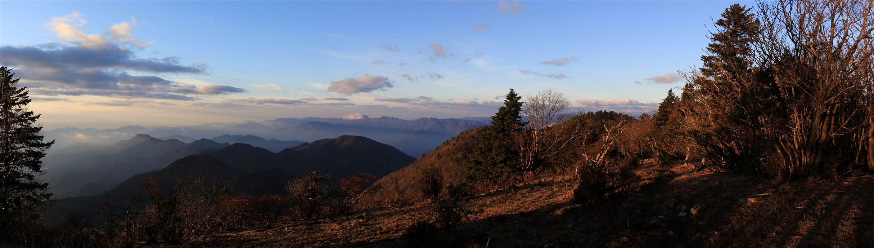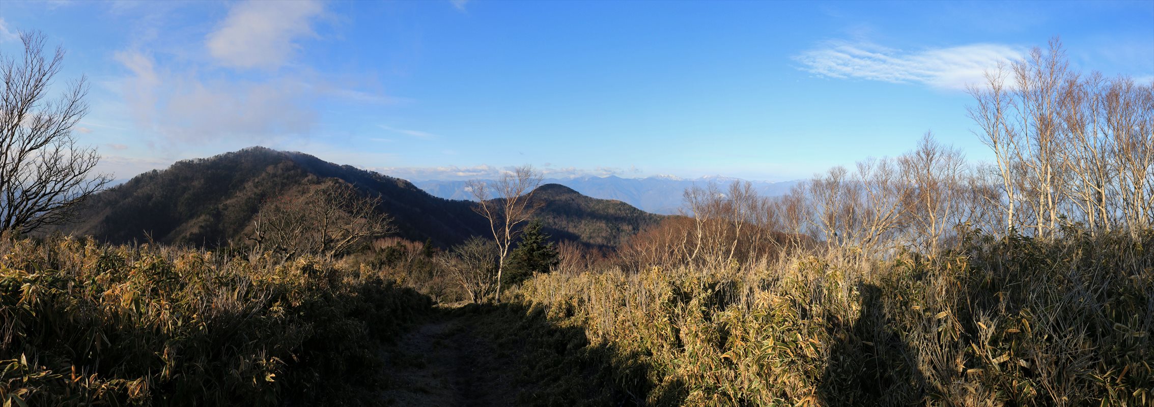パノラマ台を出発したのが16時手前。いい感じに日が傾いてきましたが、当初の予定より大幅に遅れているのでもう少し進んでおきます……この付近は日帰りで登られるような山ばかりなので大荷物ではコースタイムが厳しく、気付けばずるずる遅れが蓄積していました。