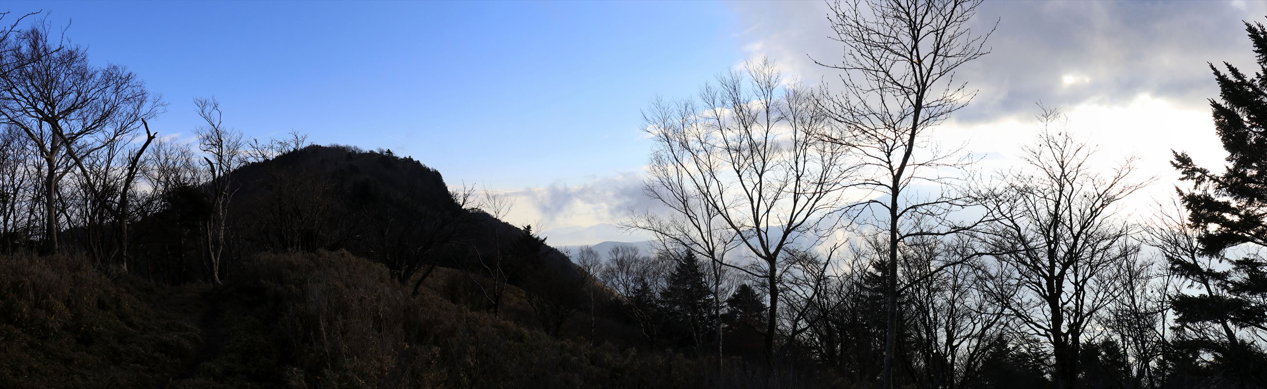 途中の1,393mピークとの間の鞍部付近は特に急峻な坂となっており、季節柄落ち葉が堆積しているので非常に歩きにくい。あまりに急な箇所はカニ歩きでジグザグにトラバースしながら下る。