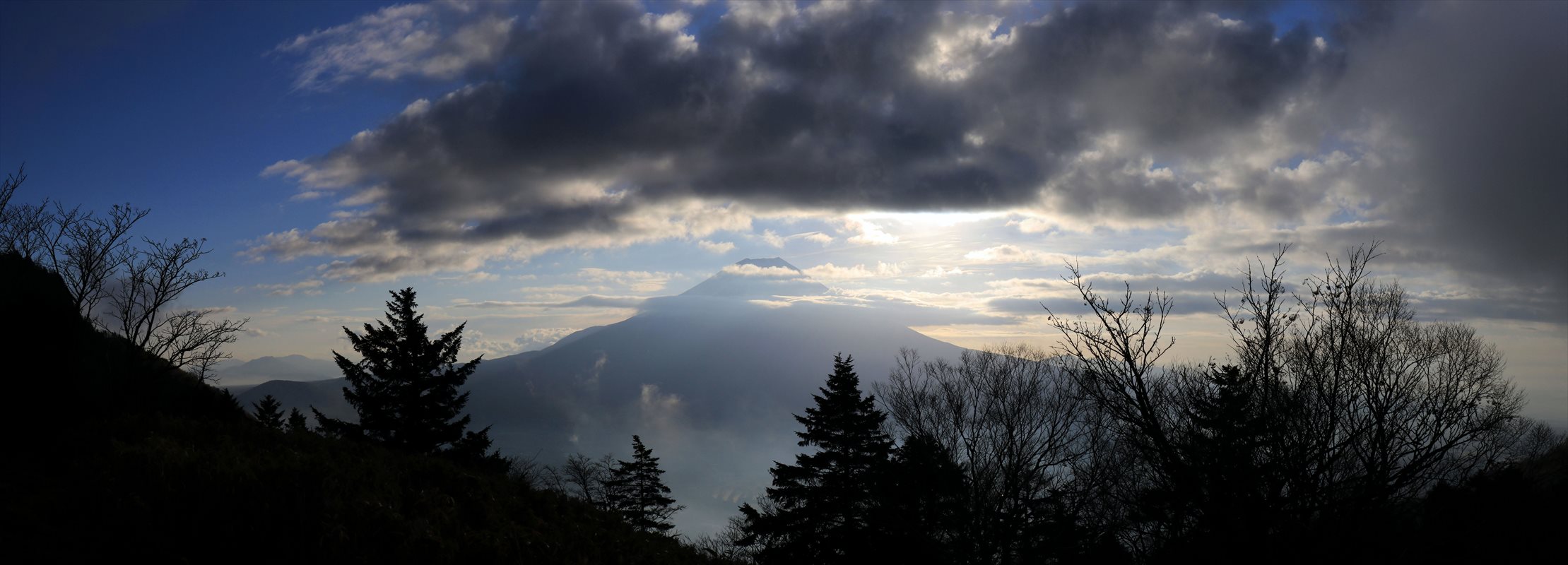 富士山と陽光。麓には朝霧高原が広がり、富士山の右肩には愛鷹山の稜線が見えます。
