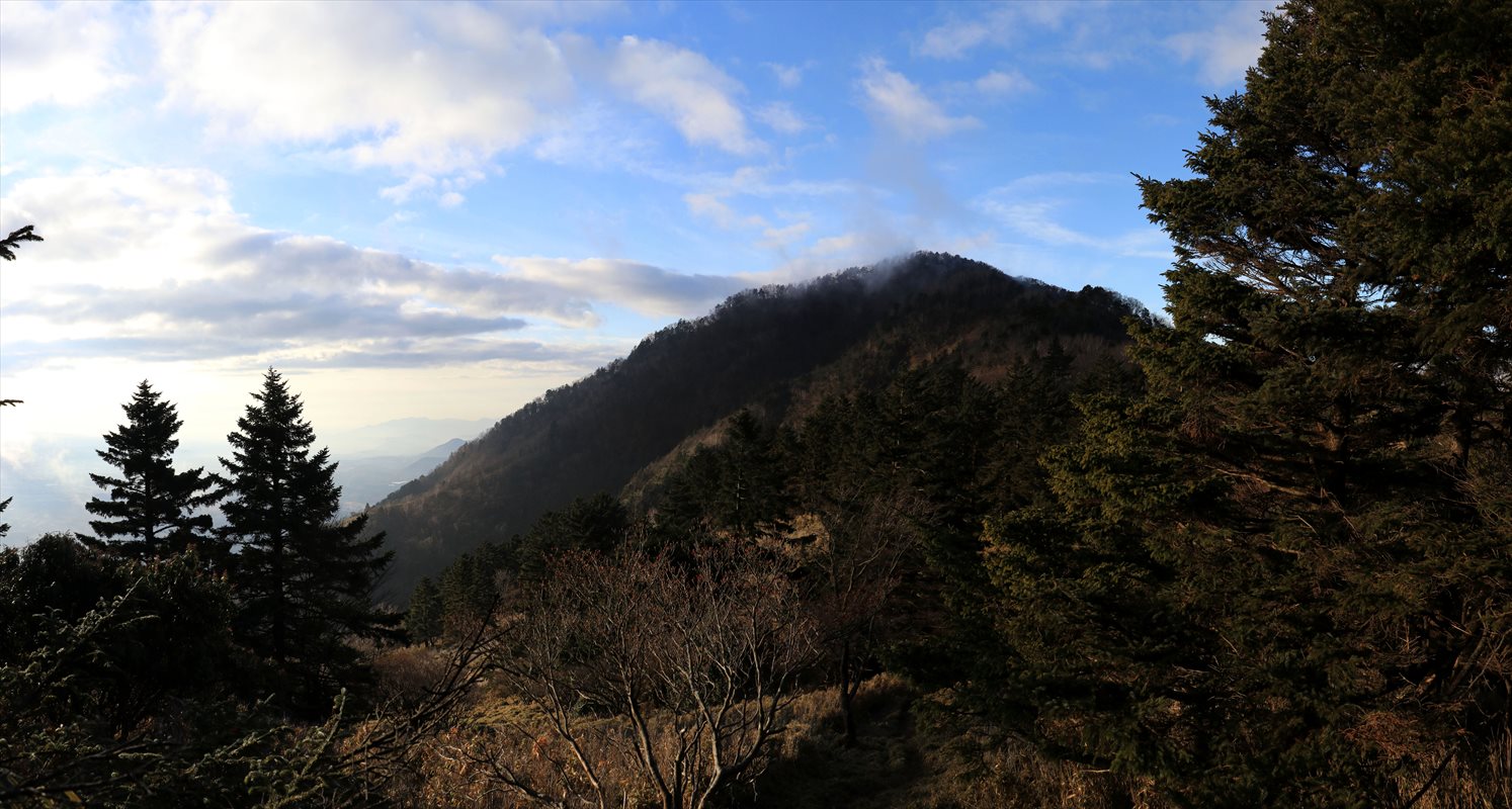 逆光の上に茂っていていまいち見通せませんが、本日の出発地である毛無山方面の展望。左手前に見えるのは今回経由しなかった竜ヶ岳のピーク。