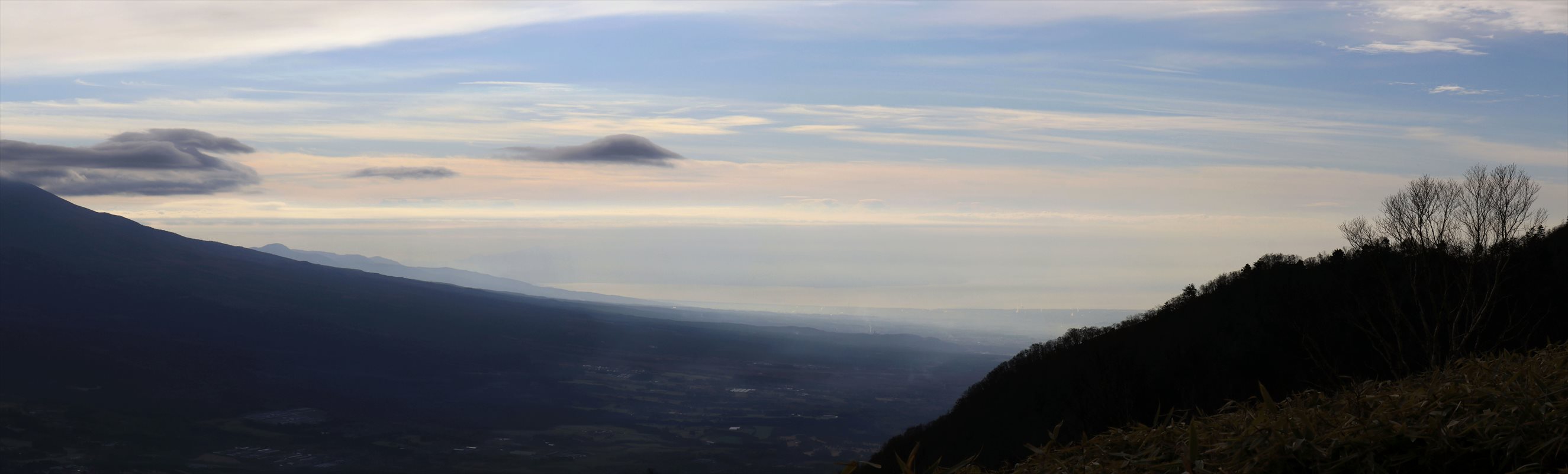 こちらは富士山より南側、駿河湾方面です。微かにですが湾沿いの海岸線や伊豆の方の山が見えますね。