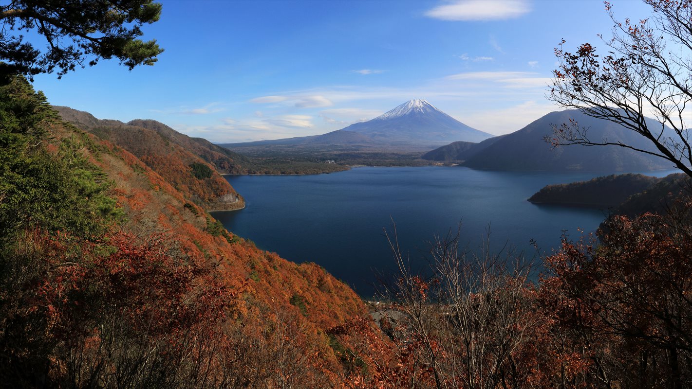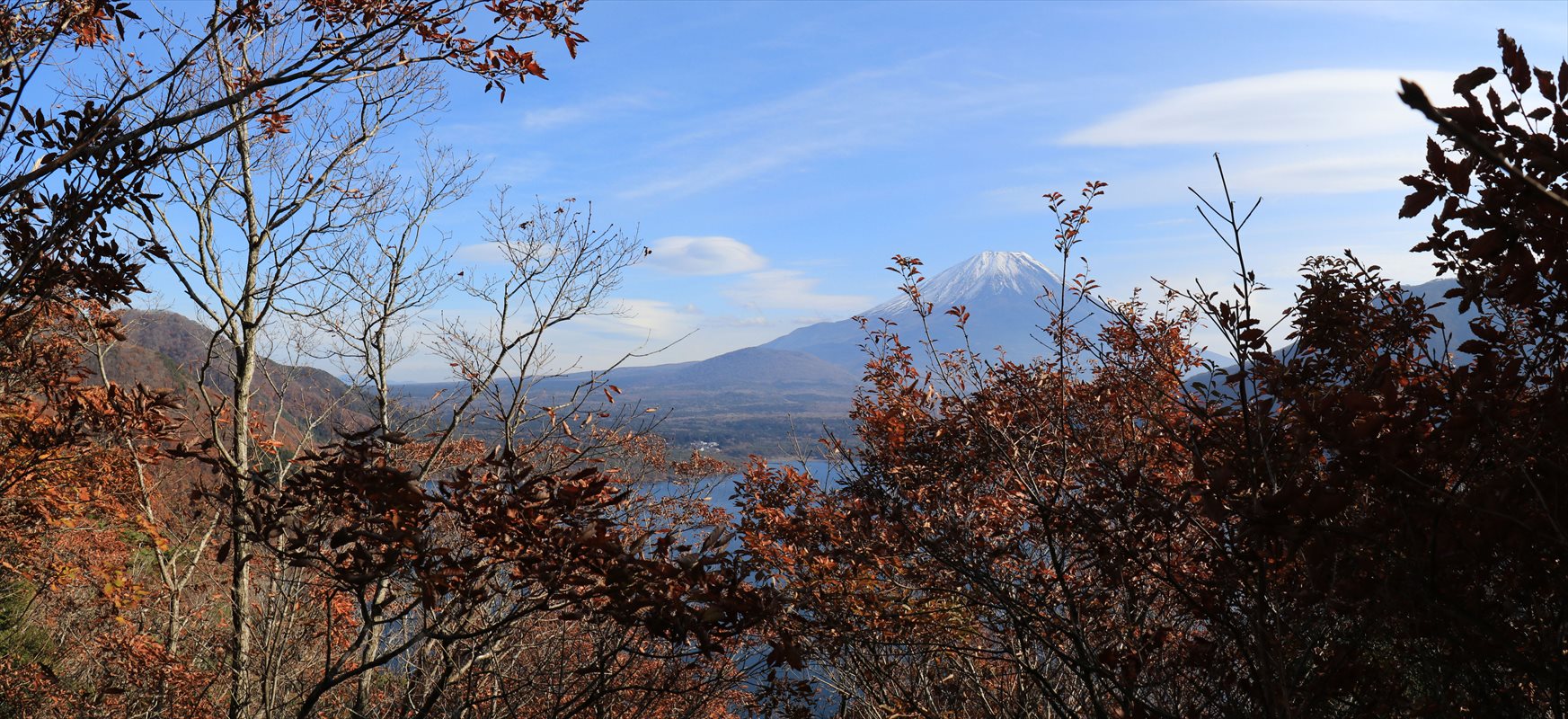 少し引いた所から本栖湖、富士山方面の展望。残念ながら逆さ富士は見えませんでしたが、紅葉が丁度見頃でいい感じ。新緑の時期も綺麗だろうなと思ったり。