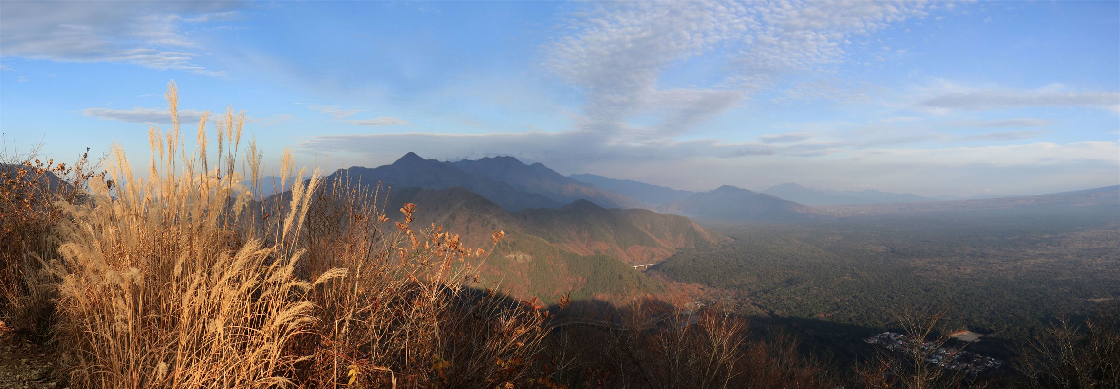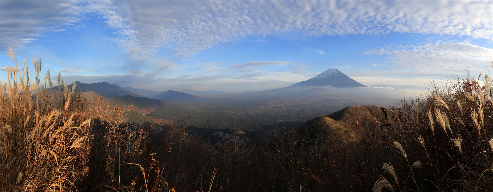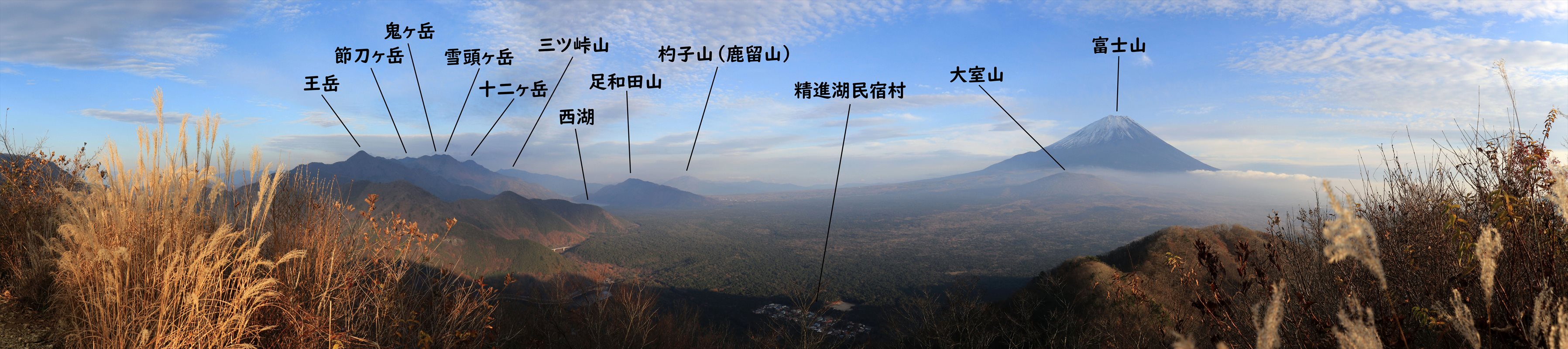 パノラマ台から富士山方面。御坂山地方面の山々を入れた広い範囲の展望……パノラマ台からのパノラマとでも。ちなみに精進湖の湖面はススキが茂っていて見えませんでした。
