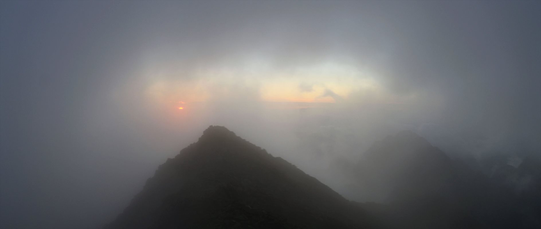 雲は随分と流れてくれましたが、太陽は未だ雲の中を脱しておらず輪郭線が朧げ。山頂の祠の存在も相まって神秘的に見えます。