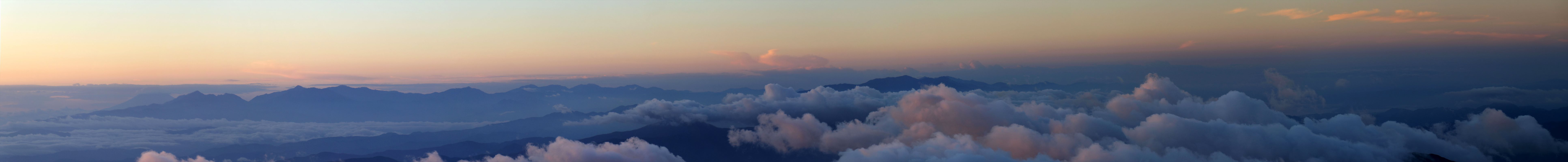 南アルプスから中央アルプスにかけての望遠です。富士山こそ山頂部が雲に隠れてしまって判然としませんが、南アルプスの主峰は深南部も含めて概ね確認できます。中央アルプスも中腹辺りまでは若干埋もれていますが、木曽駒ケ岳の右側に空木岳や南駒ケ岳辺りのピークが、手前の稜線との明暗差でよく見えています。
