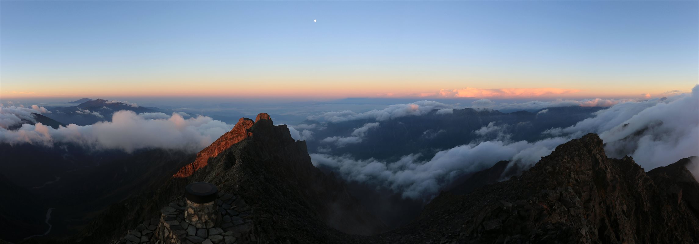 雲は概ね流れてくれましたが、槍ヶ岳を始めとした北アルプスの他の山々は未だ深々と埋もれていました。この広大な山域において、奥穂高岳のみ都合良く日の出に合わせて雲が抜けたのは僥倖という他ないでしょう。