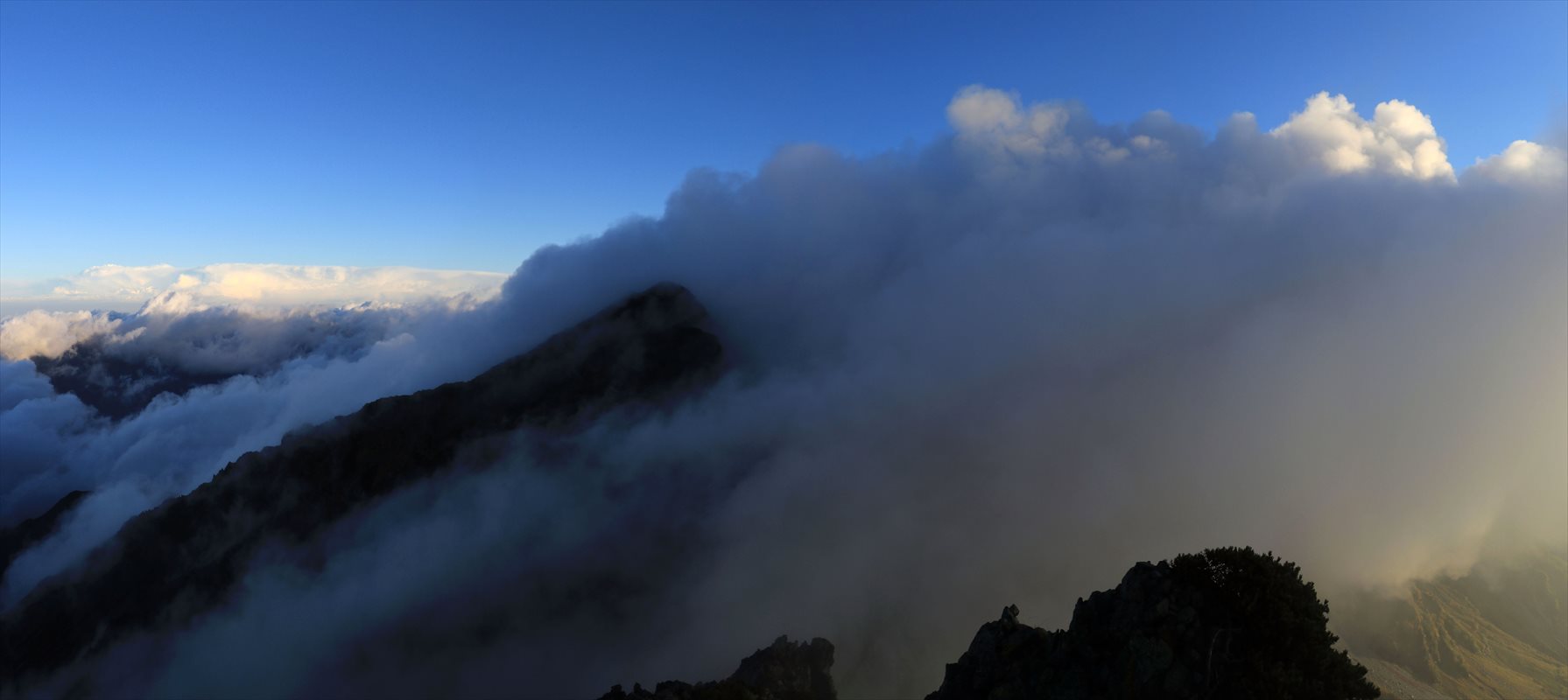 東側の展望が再び見えるようになりましたが、向こうの世界は随分と晴れている。西から流れてくる雲がこの槍穂の稜線に引っかかっているような状態なんでしょうか。