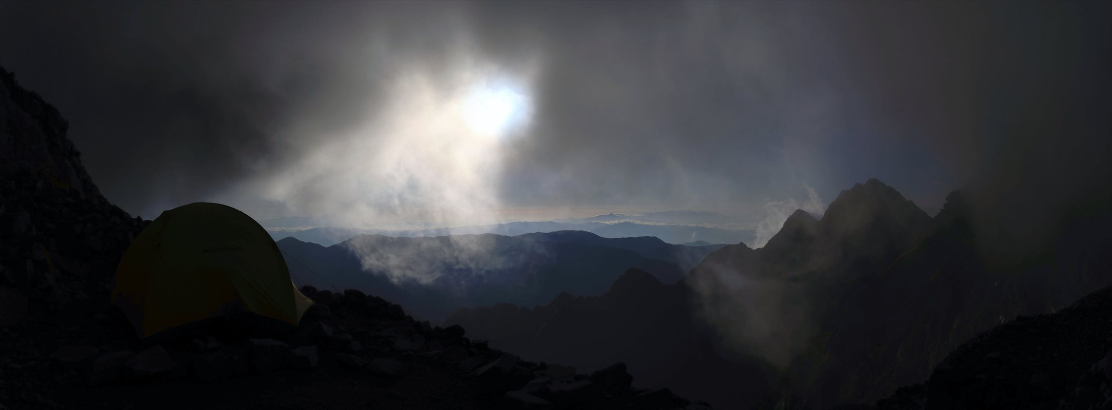 逆光気味で暗くなってしまいましたがテント場からの展望。撤収を始めた時点では雲の量もまだまだ多い。