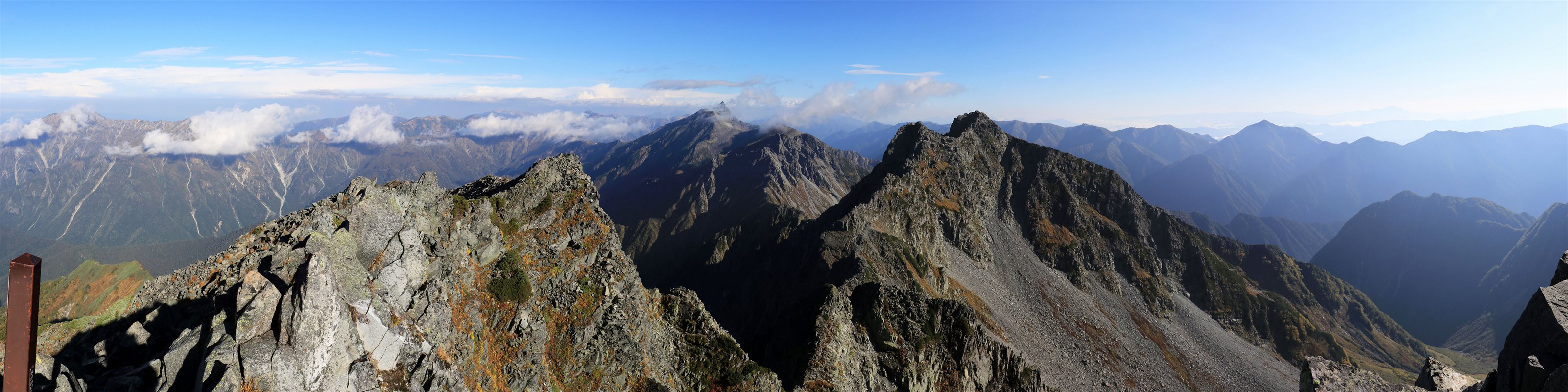 ジャンダルムを中心とした大展望。こうして視界が広がる事もありますが、すぐに雲に覆われてしまうので慌てて写真を撮影。笠ヶ岳を始め埋もれているピークも多いですが、遠く離れた中央アルプスや南アルプスの稜線は鮮明。