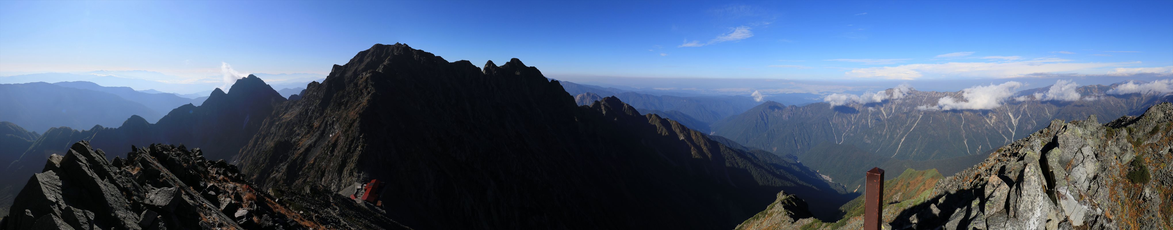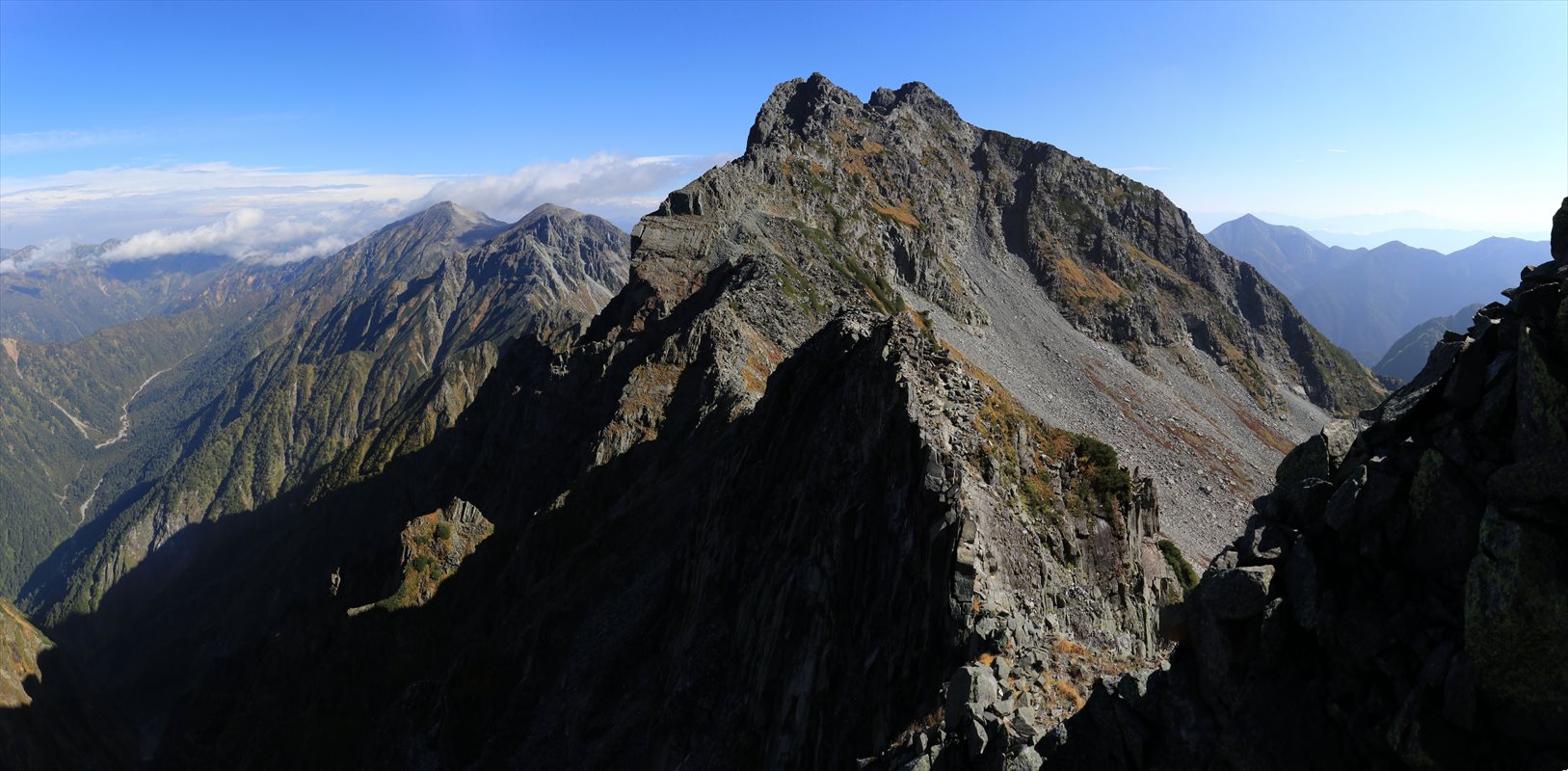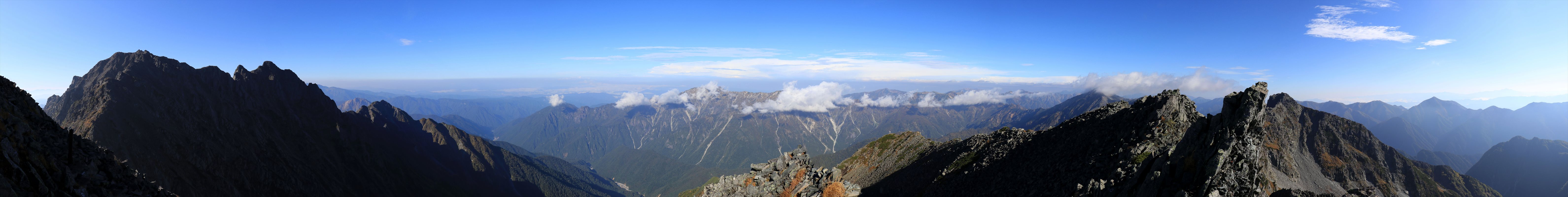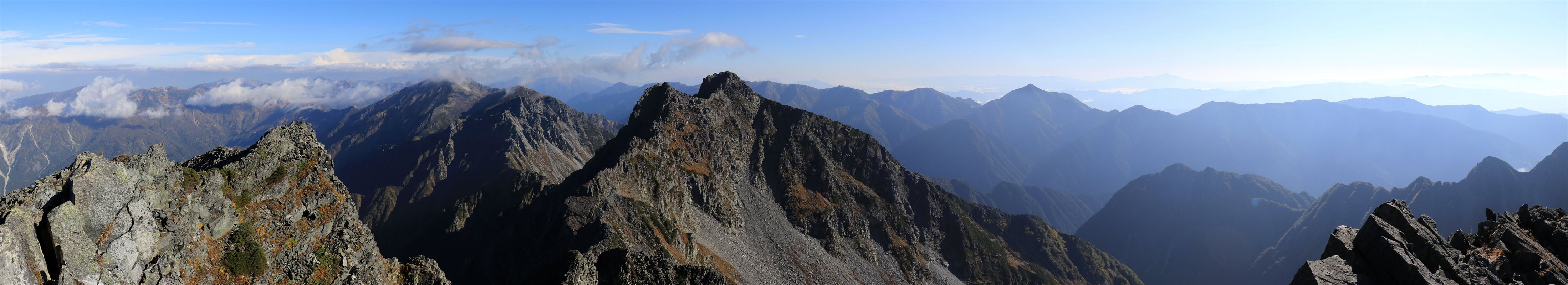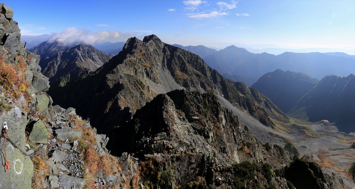 大キレットから北穂高岳方面と笠ヶ岳方面の展望を合わせたもの。谷底には新穂高温泉向かって注ぐ右俣谷の川筋が確認できます。