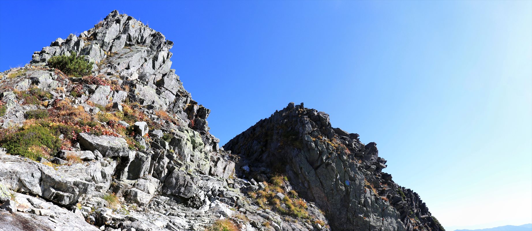 先ほど見えた岩場の続きです。この付近からA沢のコルを越えて長谷川ピークの辺りまでは急峻な登り下りが続く、大キレット越えにおいて特に難所とされる区間らしいです。