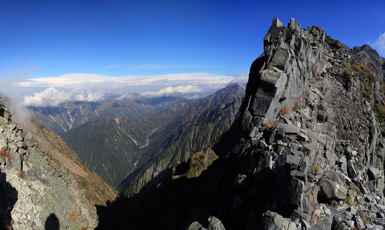 飛騨泣きを少し手前から。ちなみに飛騨泣きとは、岐阜県側(写真手前側)に落ちると助からんぞ、という意味らしいです。実際、カールが広がっている信州側と比較して此方側は谷底にすっぱり切れ落ちてるので、いざ落ちたら五体満足では済まないでしょう。