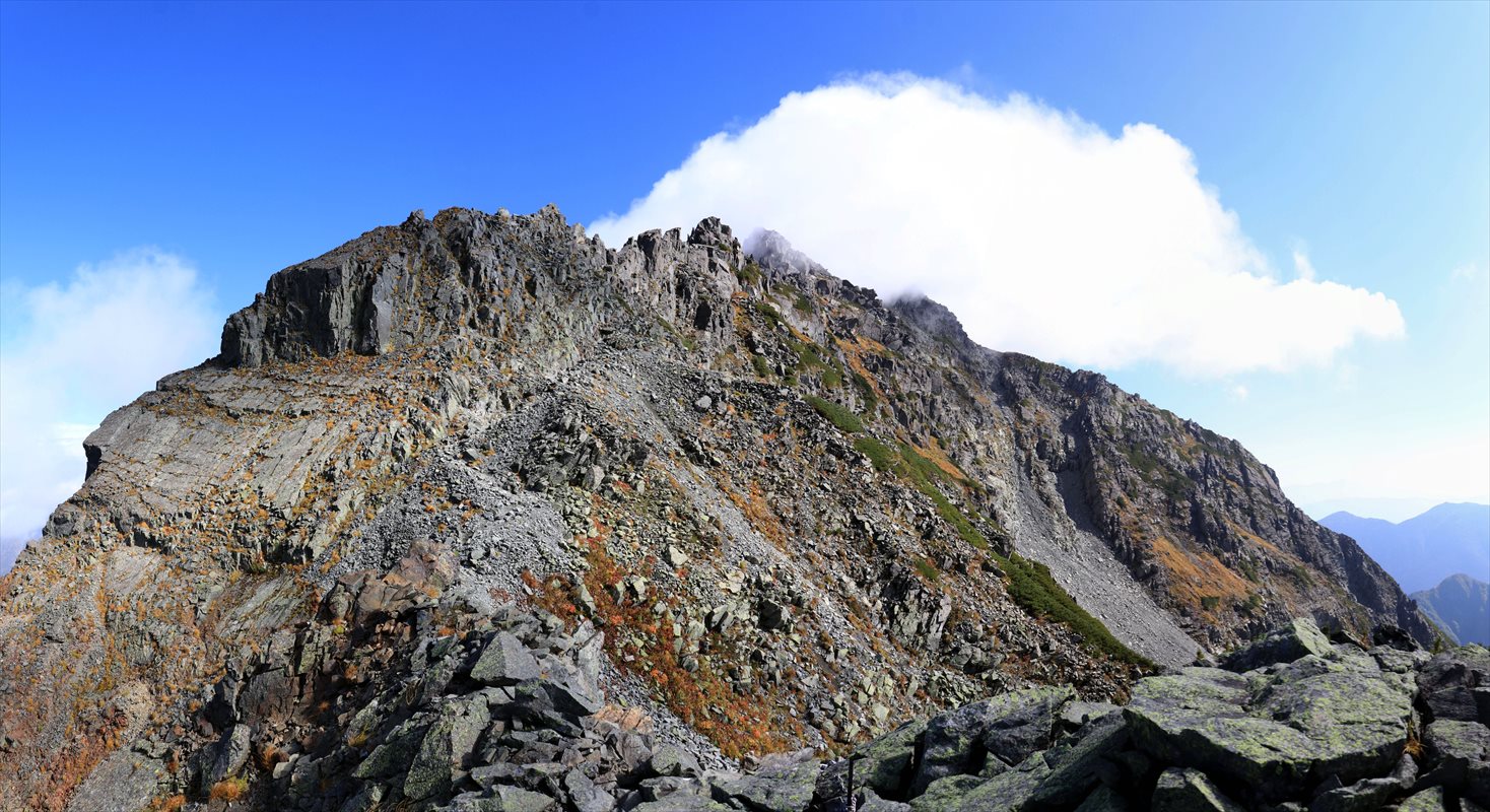 岩尾根の天辺を伝っていくような道……三点支持が取りづらい岩場が続きます。右に見えるの長谷川ピークが徐々に近付いてきた。