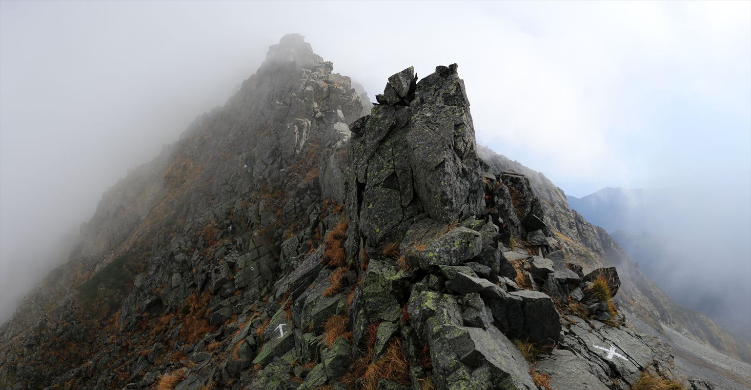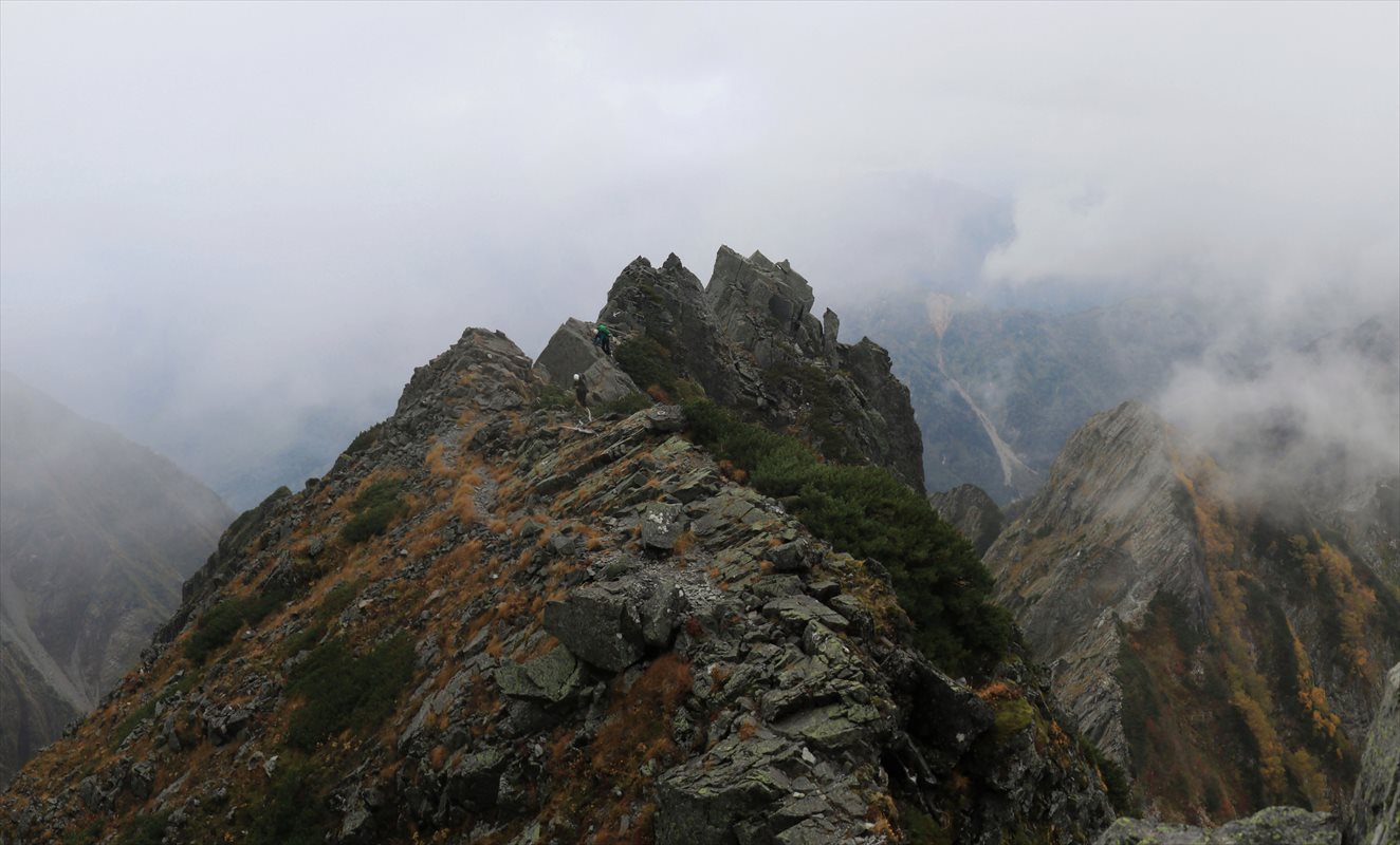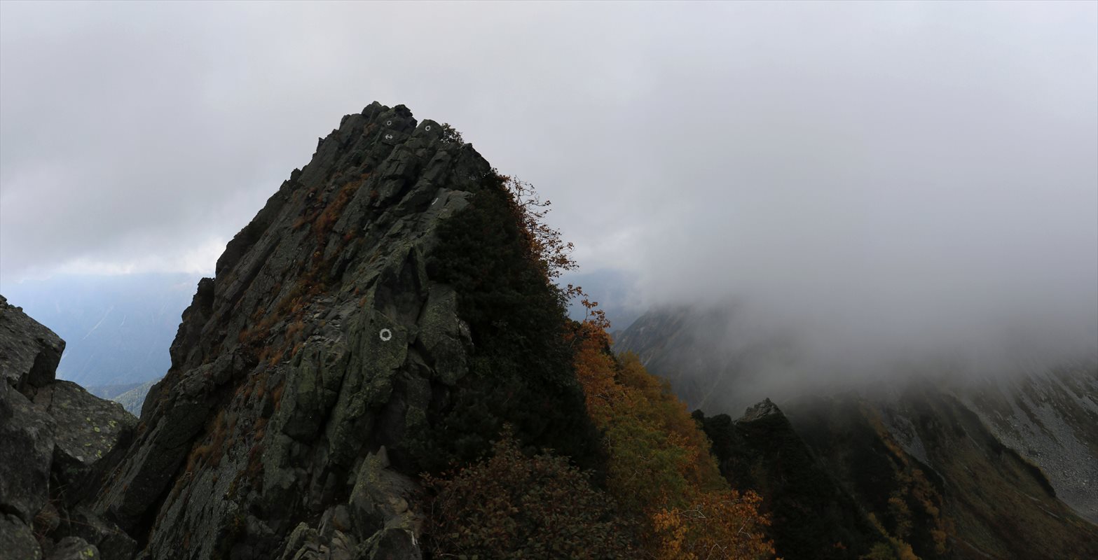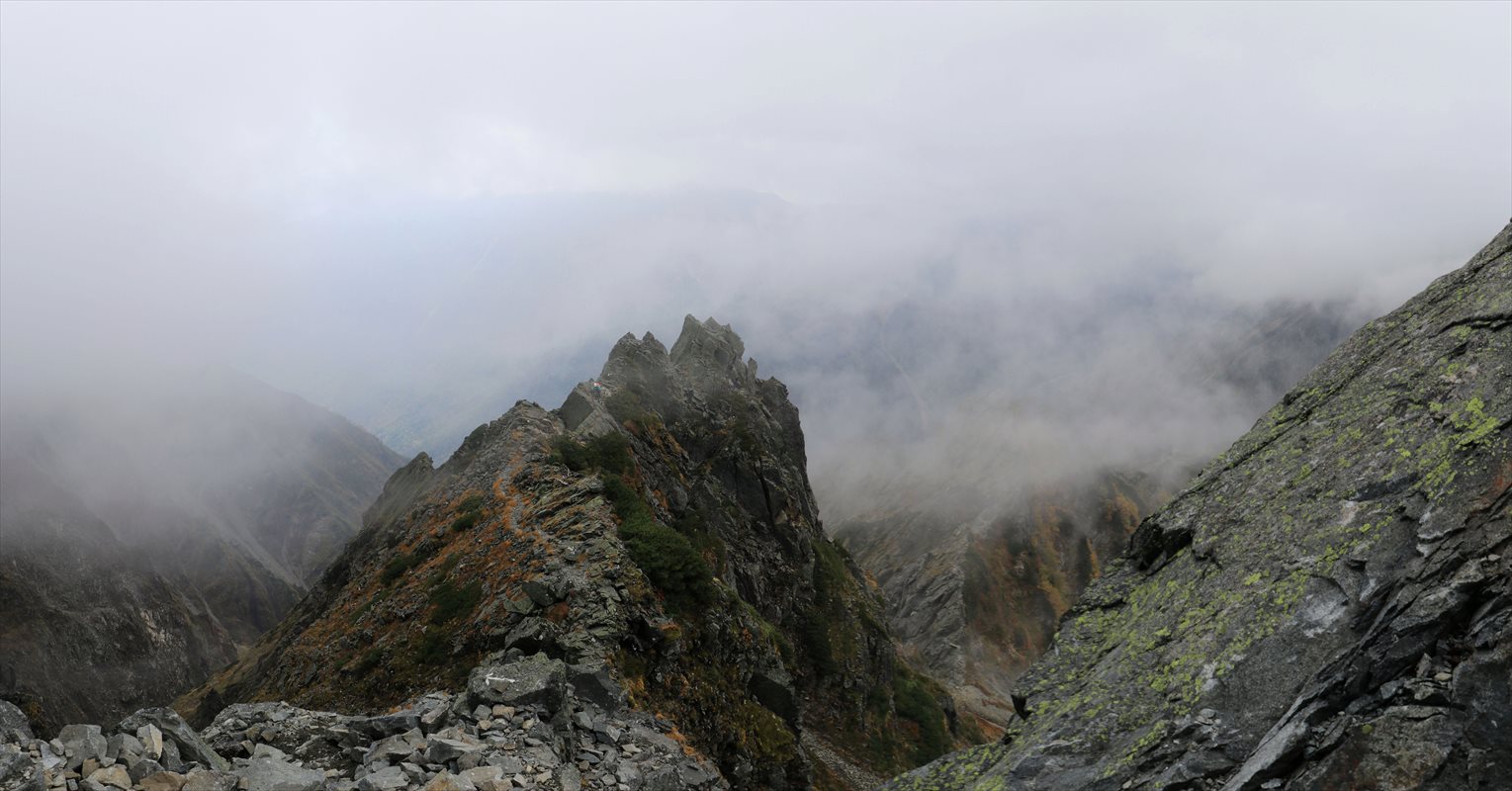 少し進むと進行方向の雲が若干抜けてくれました。手前から伸びる切り立った岩尾根や、奥に見えるA沢のコルの鞍部なんかも見通せるように。
