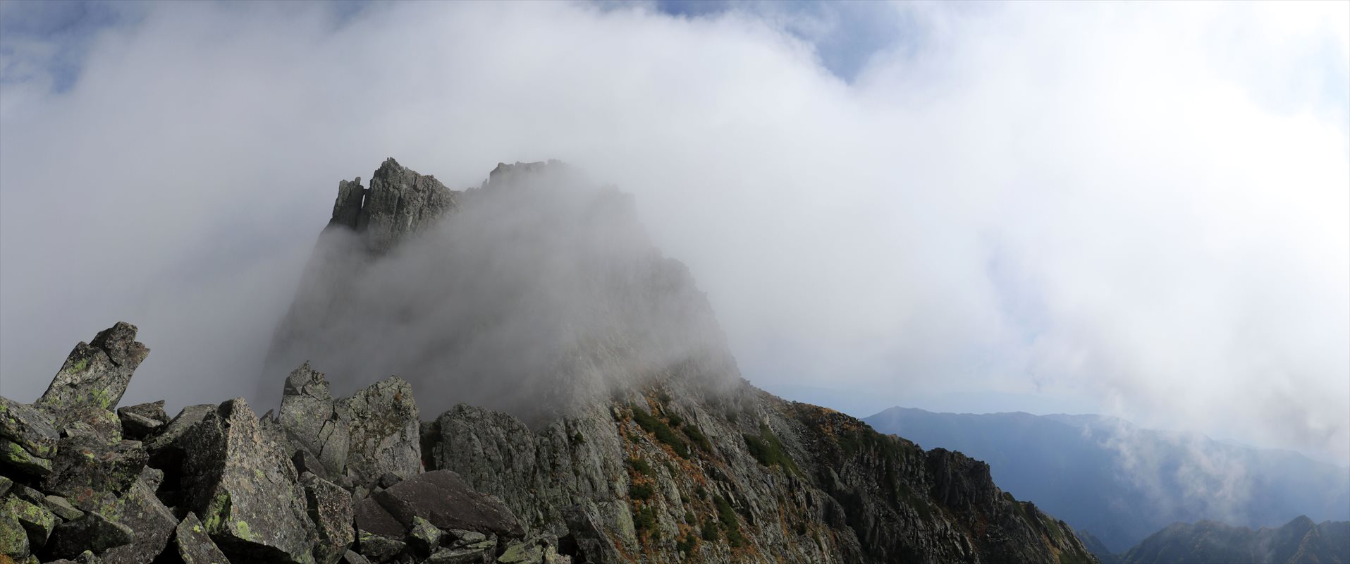 こちらは吊尾根越しの前穂高岳方面。猛烈な勢いで雲が流れ、展望は目まぐるしく変化する。
