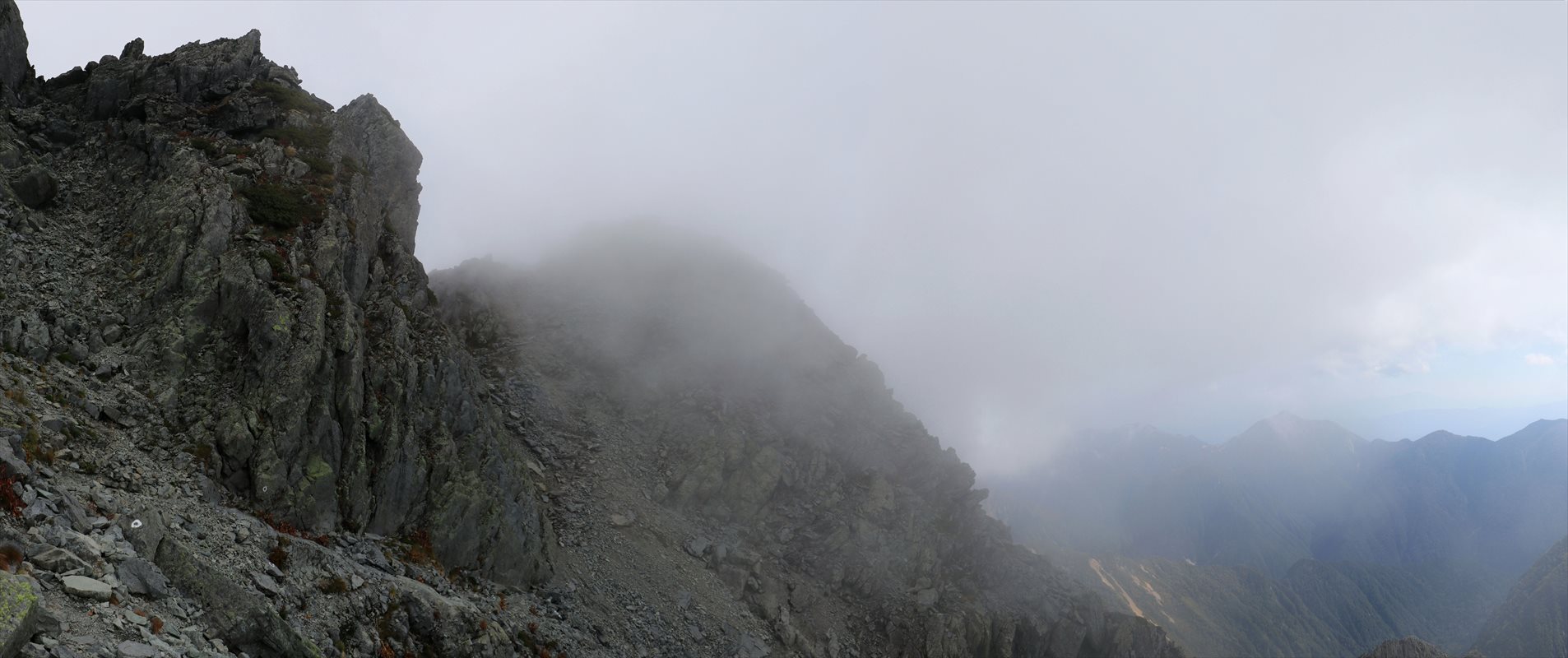 東側方面は楽しめる程度には展望が回復しましたが進行方向、本来であれば南岳や槍ヶ岳が見えるであろう方面は濃いガスに包まれています……しかし、こうもガスで行く先々のろくにピークが見えないとなると、一体どこを歩いているのかよく分からなくなる。