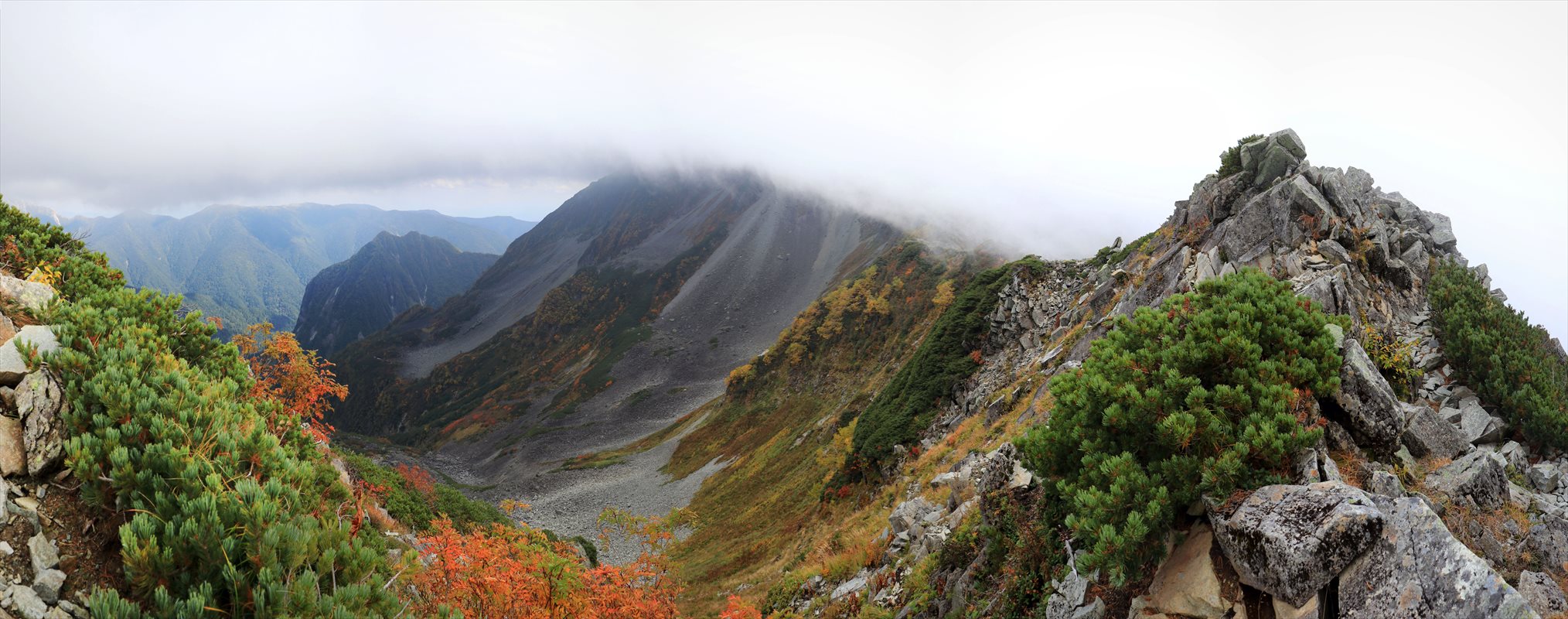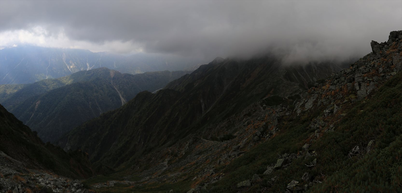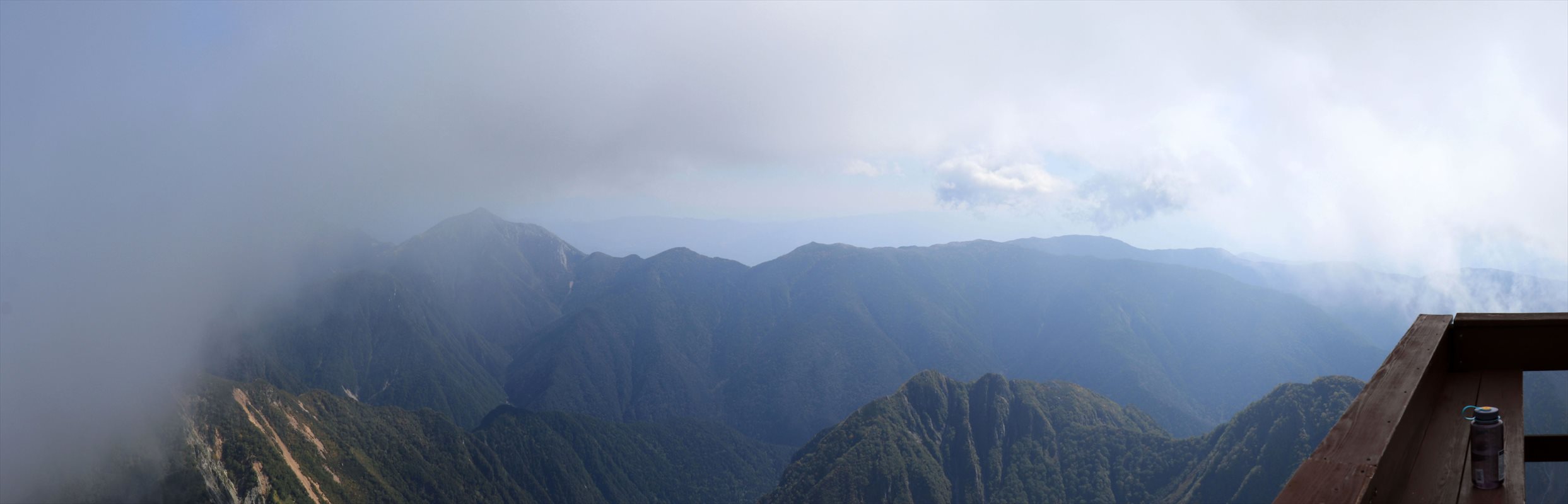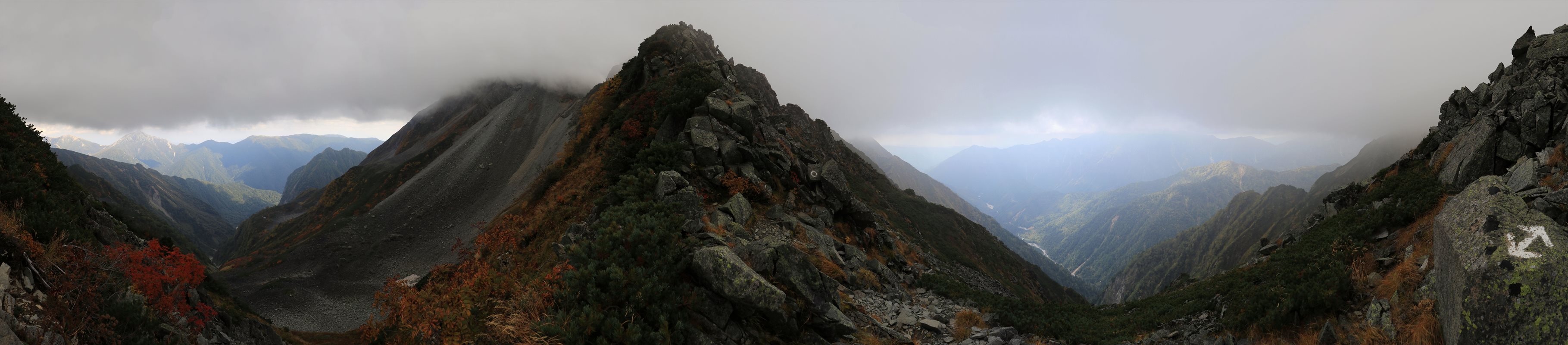 左が笠ヶ岳方面。右が双六岳、黒部五郎岳方面です。ピークはどちらも雲の中。