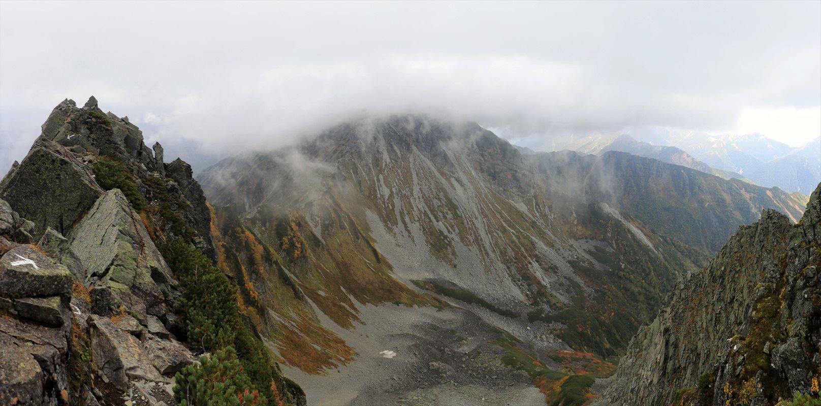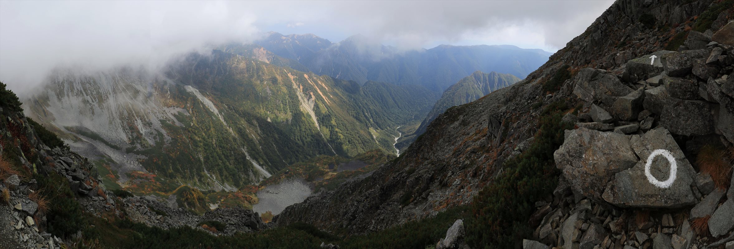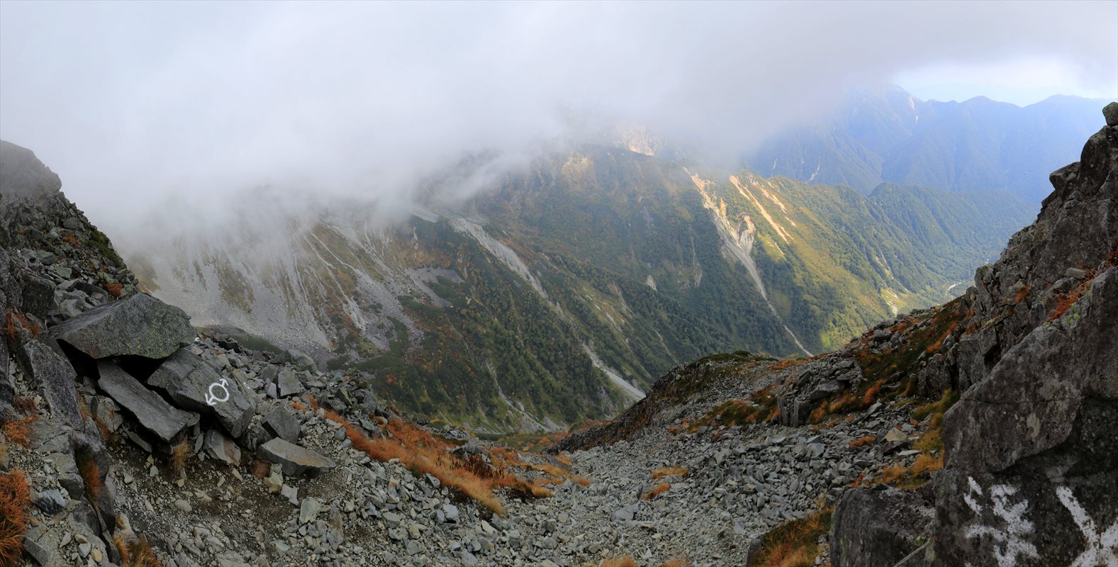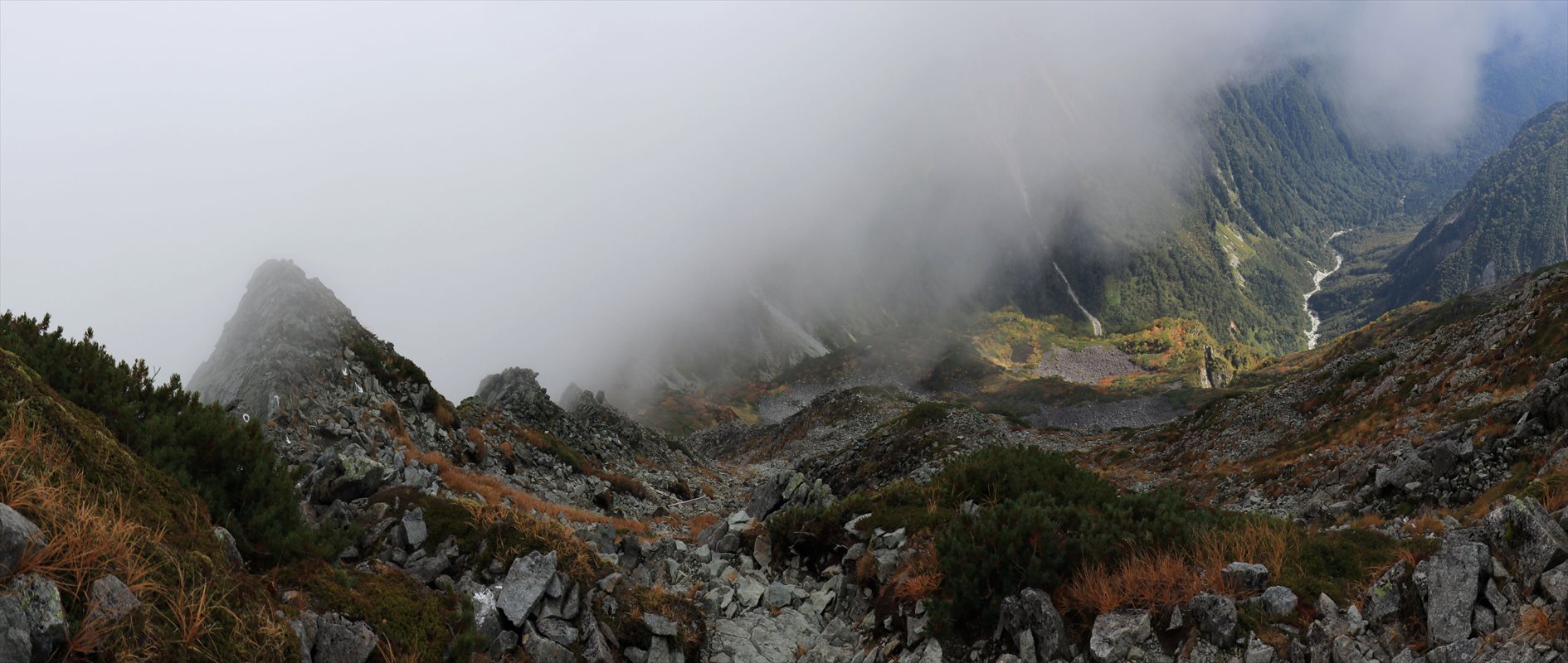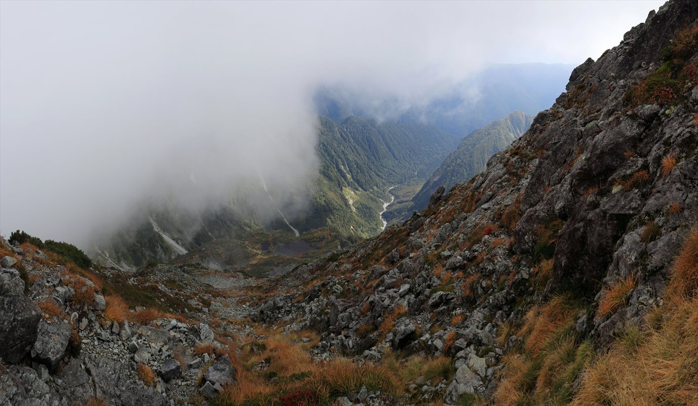完全に真っ白だったら即座に気が滅入っている所ですが、先程同様に標高の低い所は雲が少ない様子で、展望も最低限レベルですが楽しめそうな雰囲気。奥の川筋の辺りは涸沢から下流方面に進んだ先の横尾谷でしょうか。右奥には蝶ヶ岳の稜線も一応確認できる。