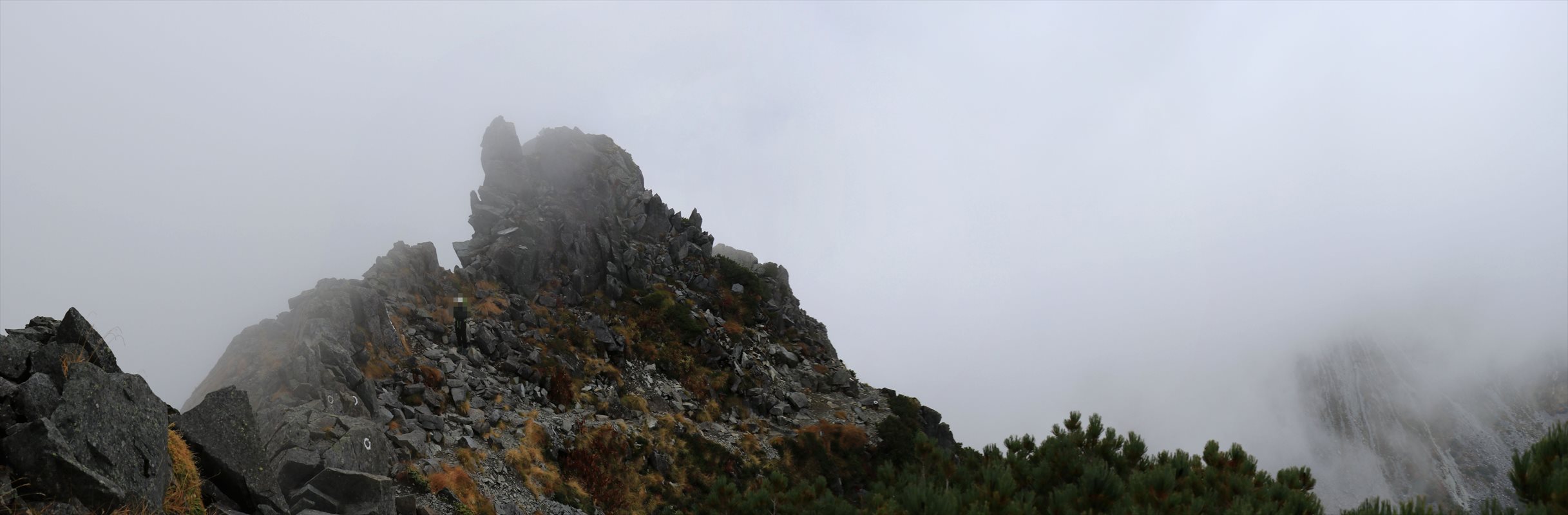 何事も無く進めていた所から一転、少し険しそうな岩稜帯です。ガスが切れてくれたお蔭で中々のスリル。