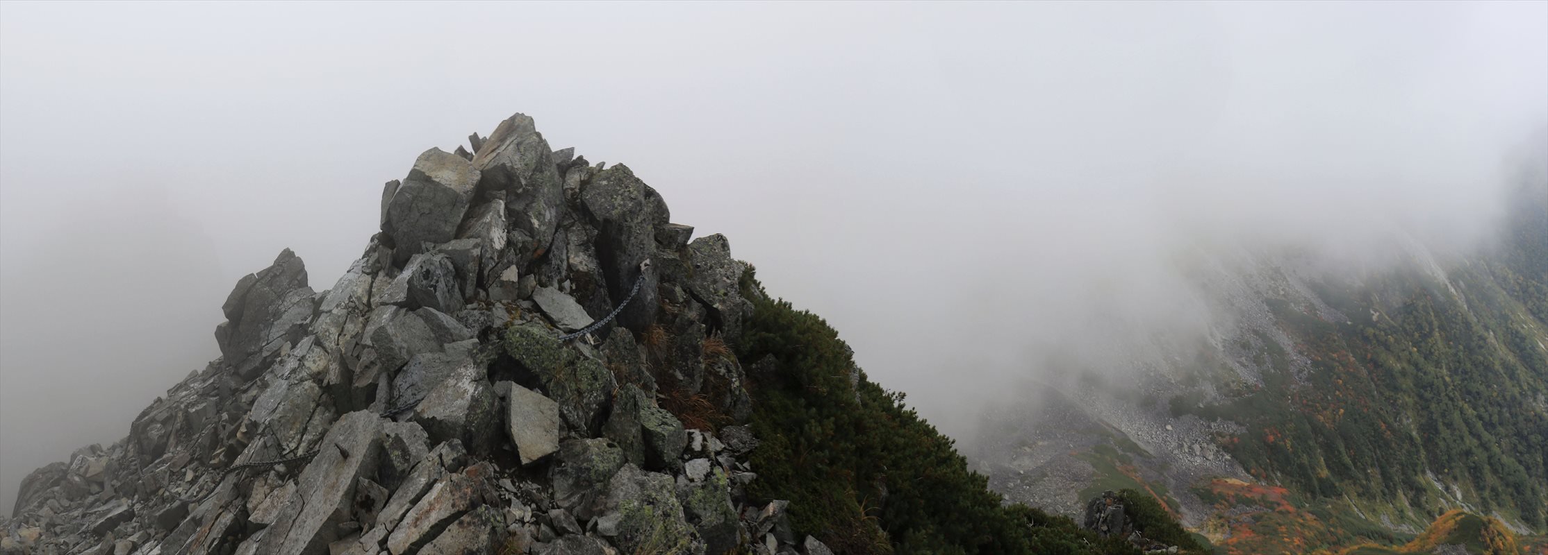 進行方向は相変わらずガスもくもくで何が何だかという感じ。スリリングな岩場が続いても対して高度感が湧かないので何の感慨も湧かず進んでしまう。
