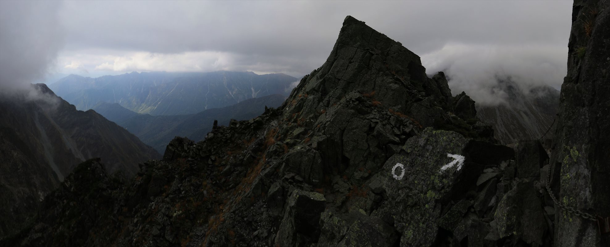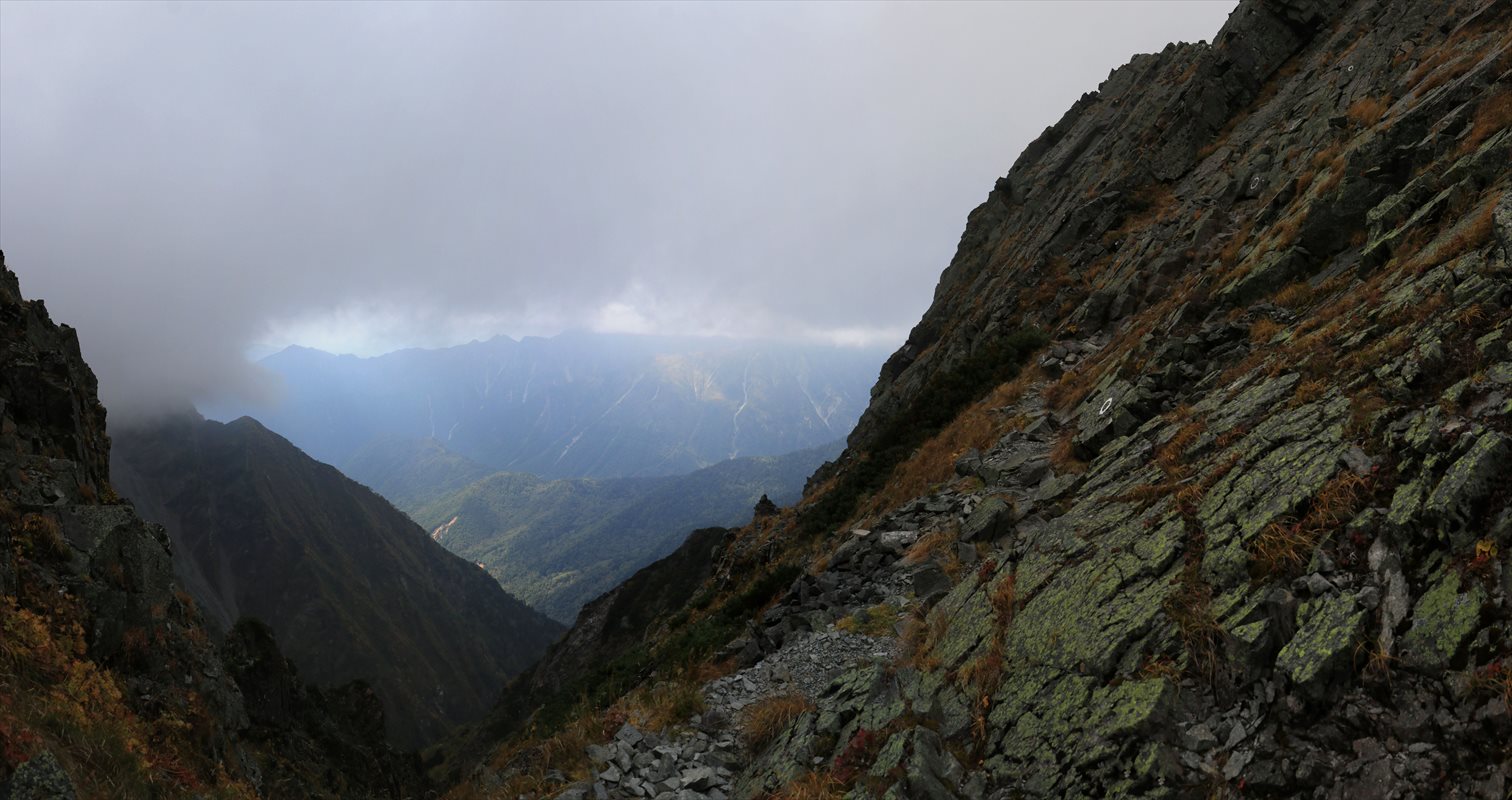 長谷川ピークへの登りと雲立ち込める大キレット。最後の方も険しそうな岩場が見えますが、下りだと少し怖いかなという程度でした。