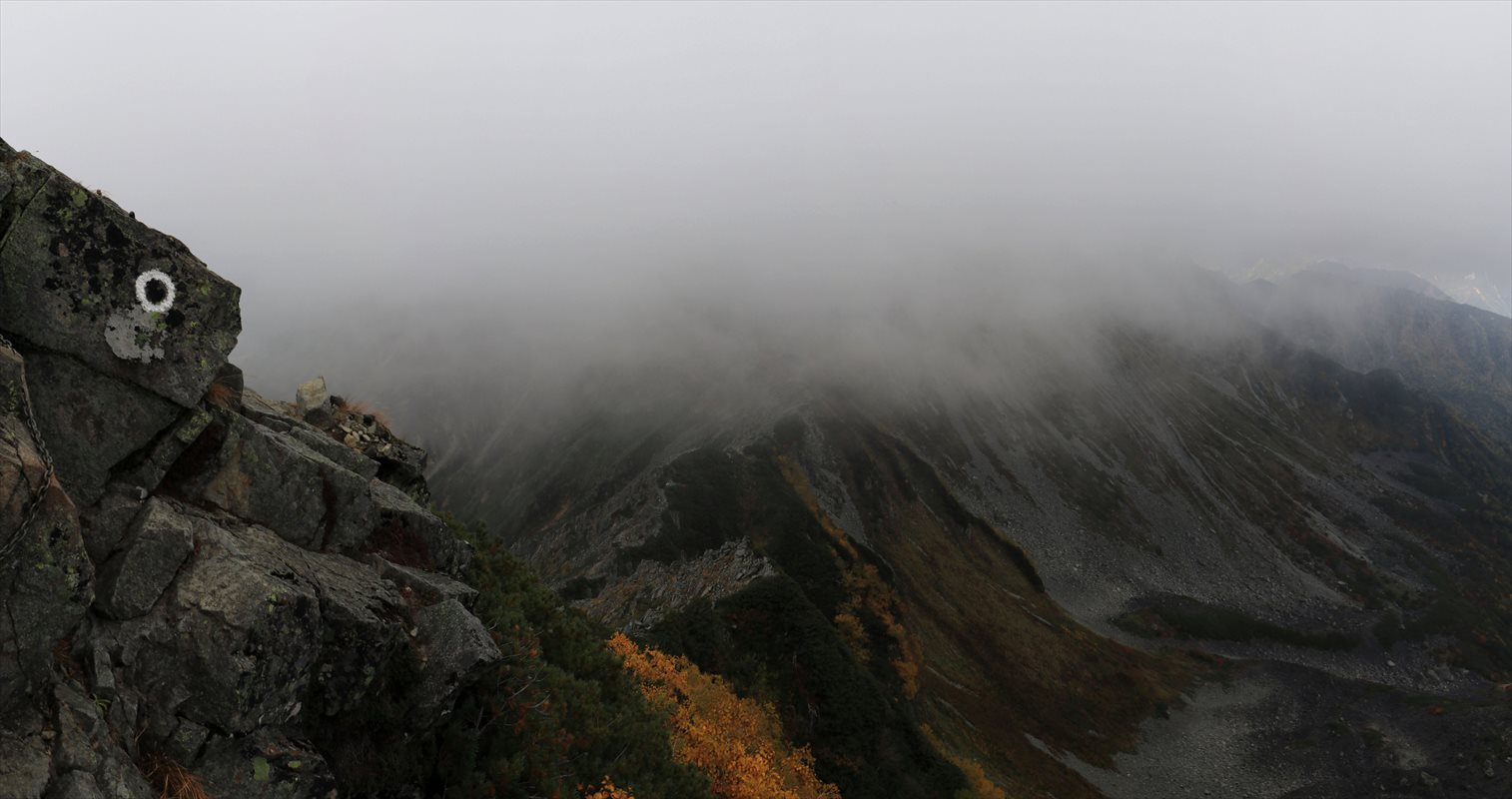 そして、いよいよ大キレットへの下り……しかし南岳方面のガスは依然として分厚い。完全に視界不良という訳ではないですが、気を滅入らせてくれるには十分という雲の厚さ。