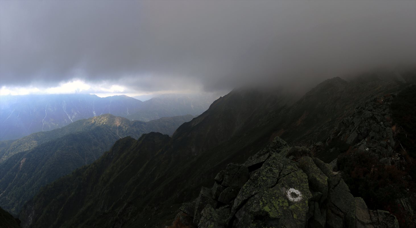西側の雲が一瞬だけ抜けて笠ヶ岳方面の稜線が。しかしやはり笠ヶ岳のピークは見えない。