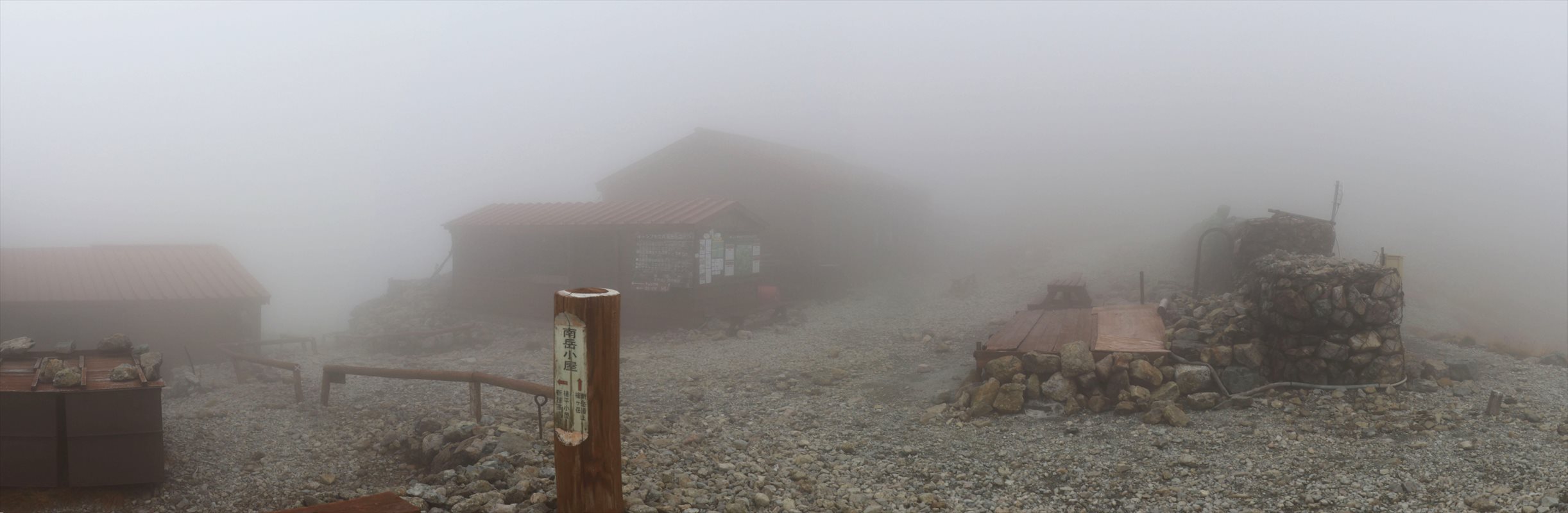 南岳直下に位置する南岳小屋に到着。一帯は特にガスが濃く、どこに小屋があるのか分からない程に視界不良でした。これが小屋の入口か、と思って入ろうとしたらトイレだったり。