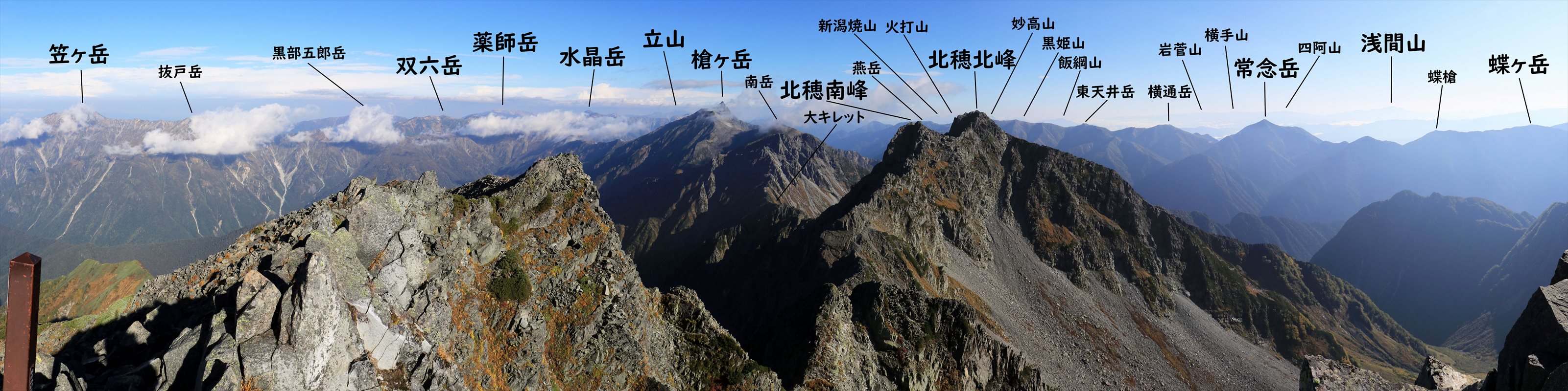 望遠じゃないので細かいピークが見辛いですが山名入りも一応作ってみました。黒部五郎岳を始め雲に隠れているピークも多いので参考程度に。
