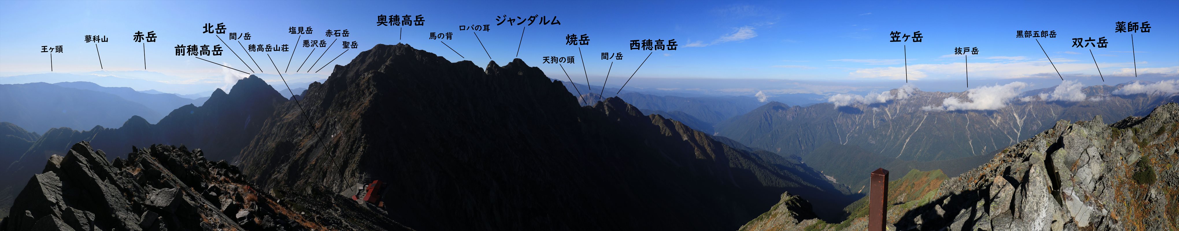 こちらは南側、奥穂高岳方面の展望。一つ前の槍ヶ岳方面の写真と合わせれば360度の展望という所。奥穂高岳を中心に左側に前穂高岳、右側にジャンダルムと西穂高岳。焼岳辺りを歩いていた頃、行程前半で見えていた構図とは鏡映しのように正反対の並び。
