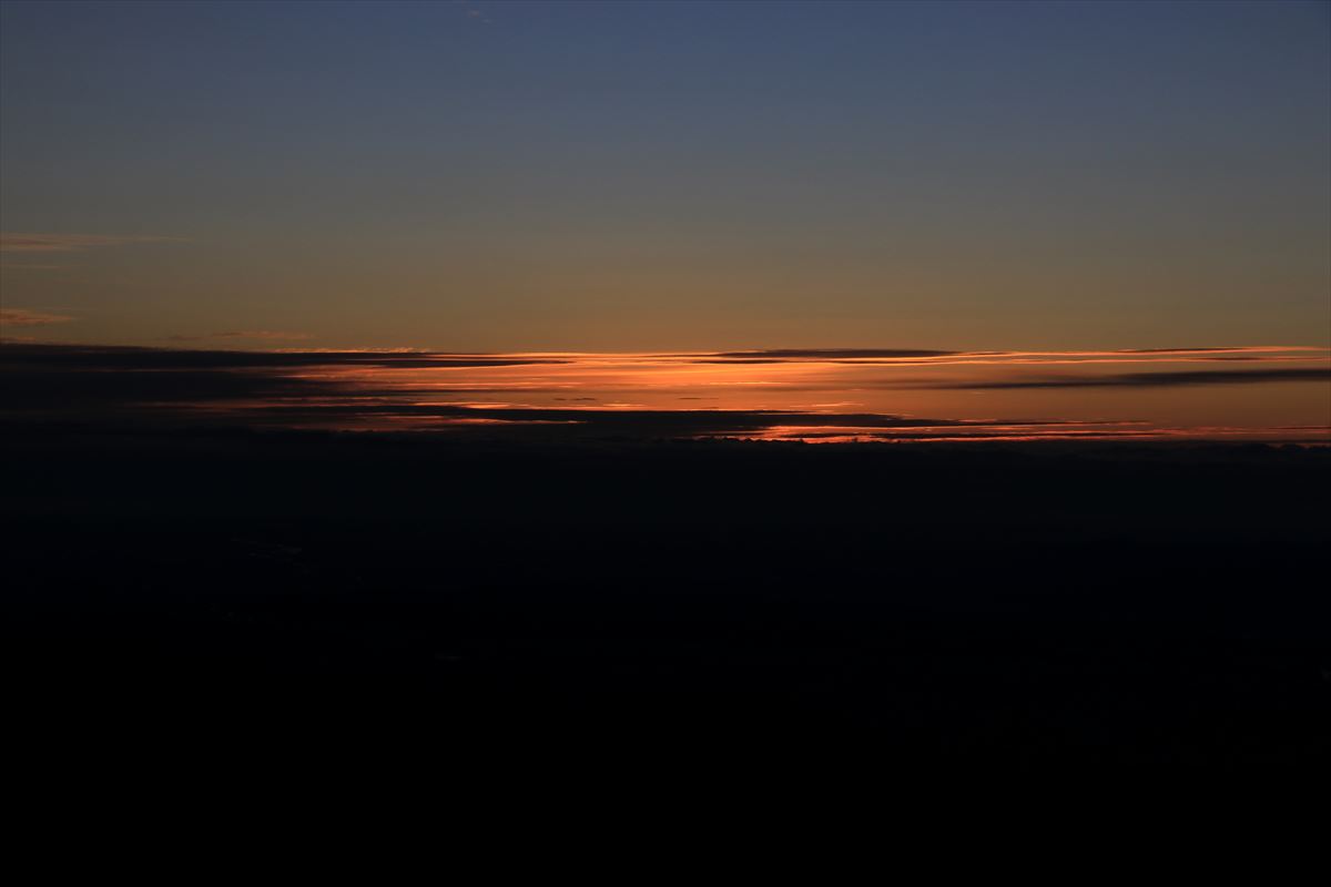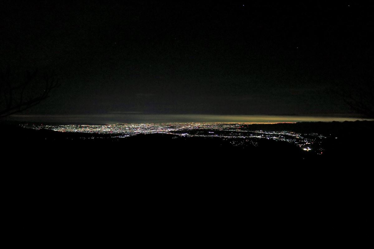 午前4時頃の鼻曲山の山頂からの夜景です。この日は雲の多かった前日とは打って変わって雲一つと無い好天。そして冬場という事で空気が澄んでおり、相当遠くまで見通せており、この時点で既に都心部にある東京スカイツリーが見えていました。