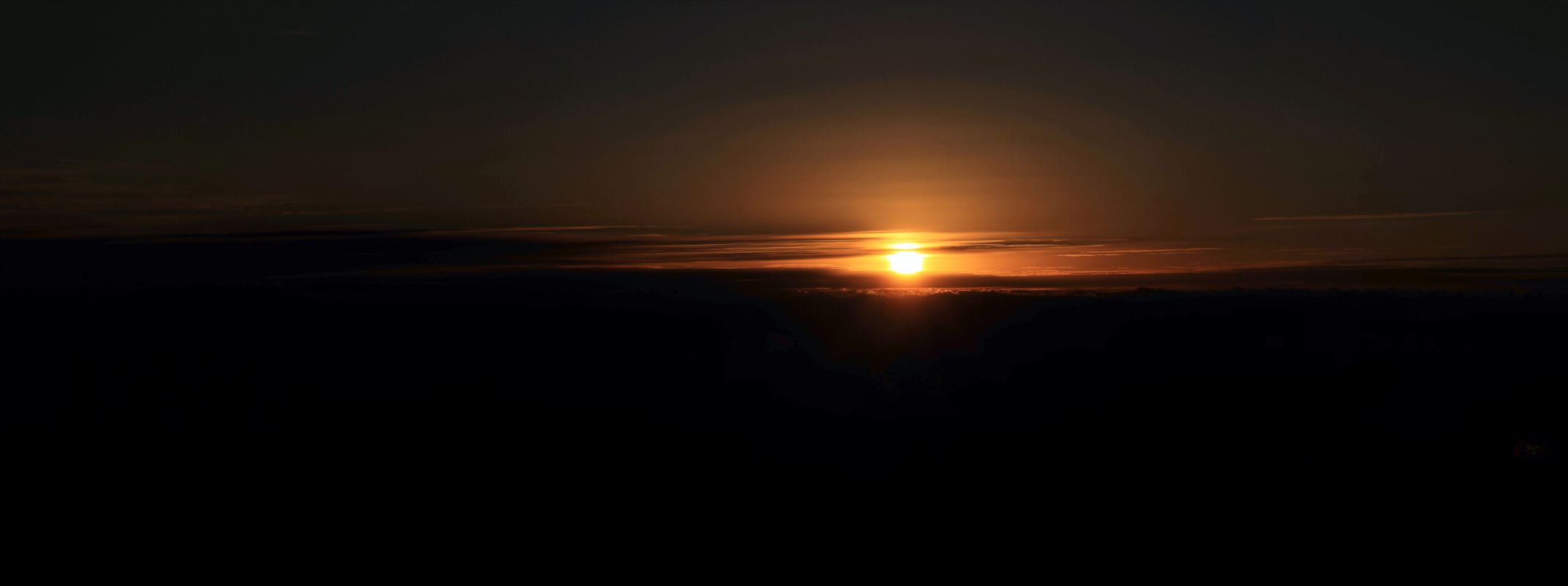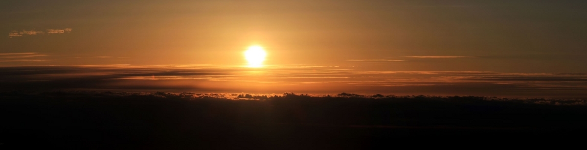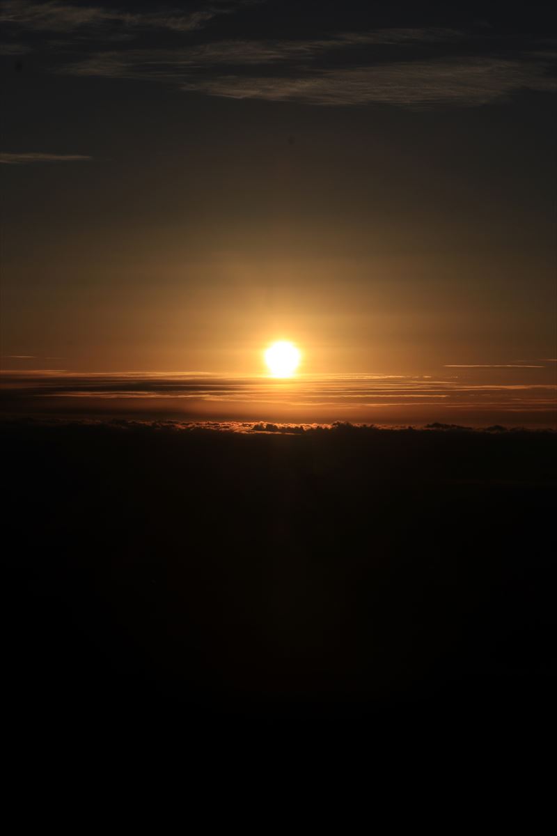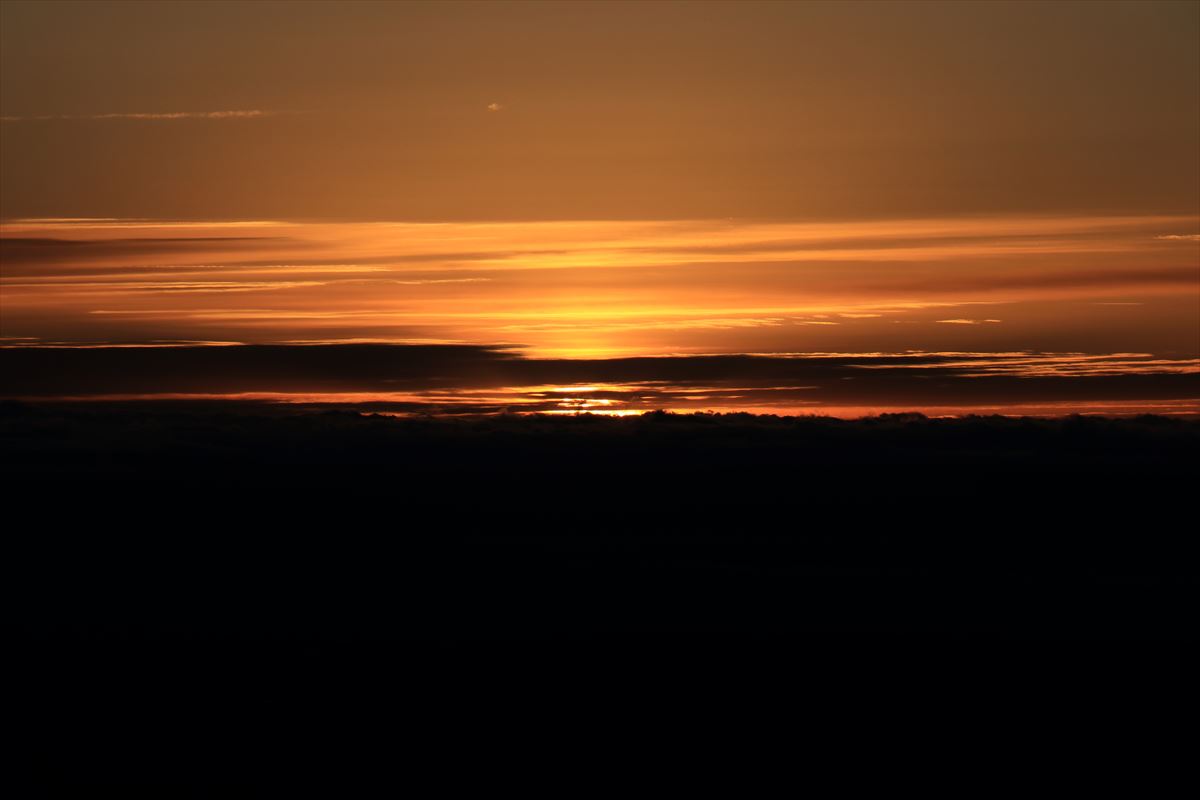 地平線近くの雲と、その少し上の雲との間。サンドイッチのように挟まれた朝日を臨む。
