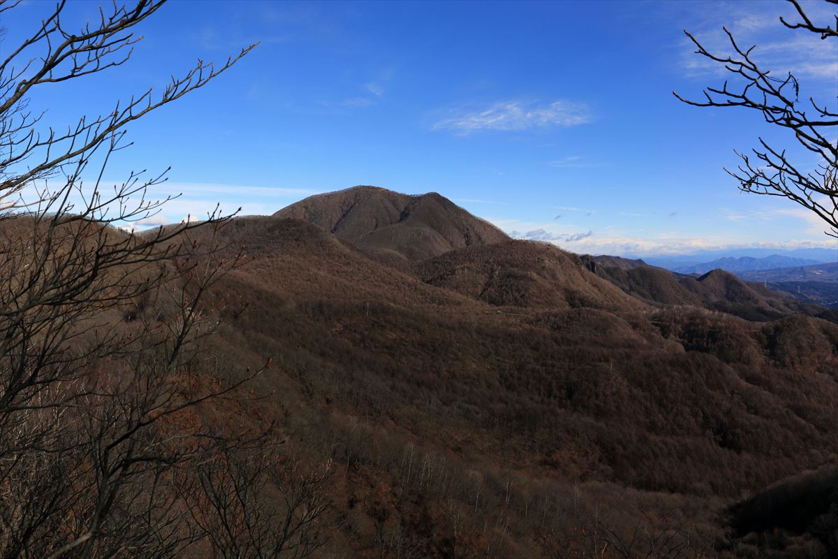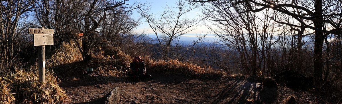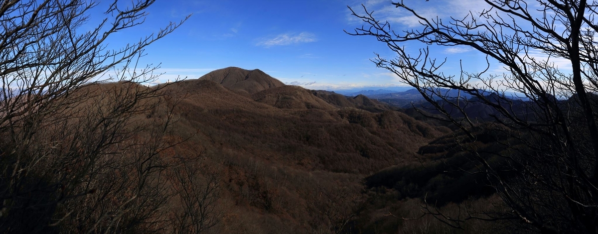 こちらは浅間山とは反対側、榛名山や赤城山が見える方面。すぐ右の所に見える特徴的なピークは前日通過した鼻曲峠から東側に伸びる尾根上の角落山です。