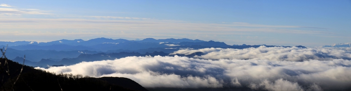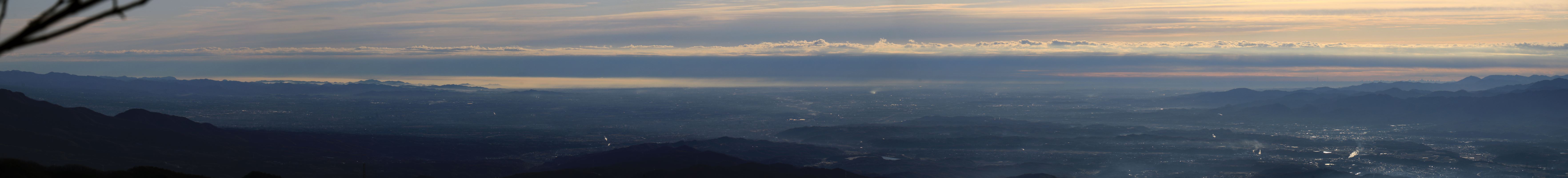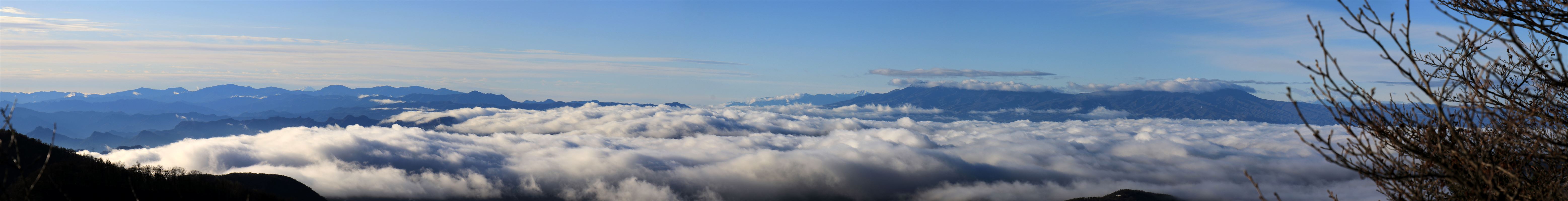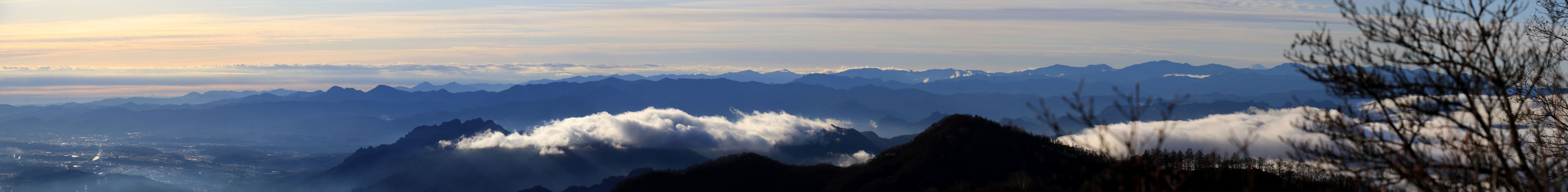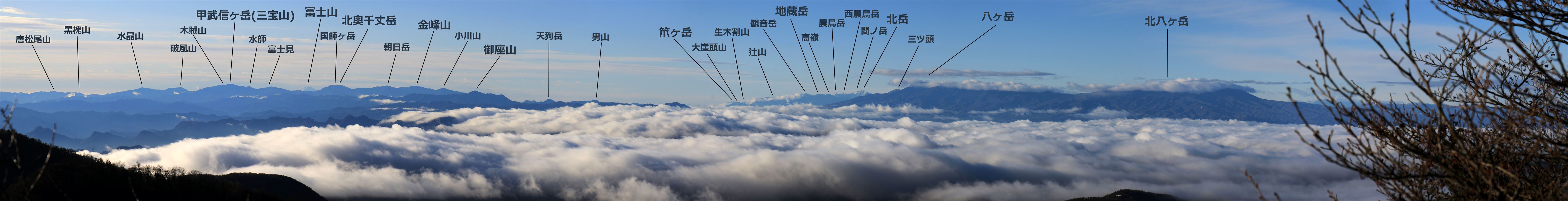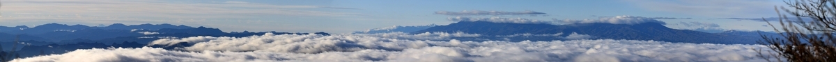 奥秩父山塊から南アルプス、八ヶ岳までの望遠を繋げてみたもの。比較的近くにある八ヶ岳は稜線上が雲に覆われてしまっておりピークの判別はできませんが、それより距離的に遠い南アルプスは概ね鮮明に見えている。