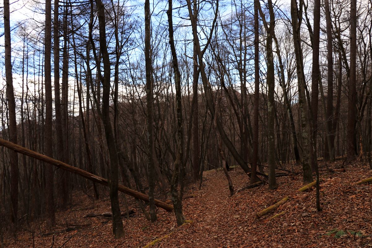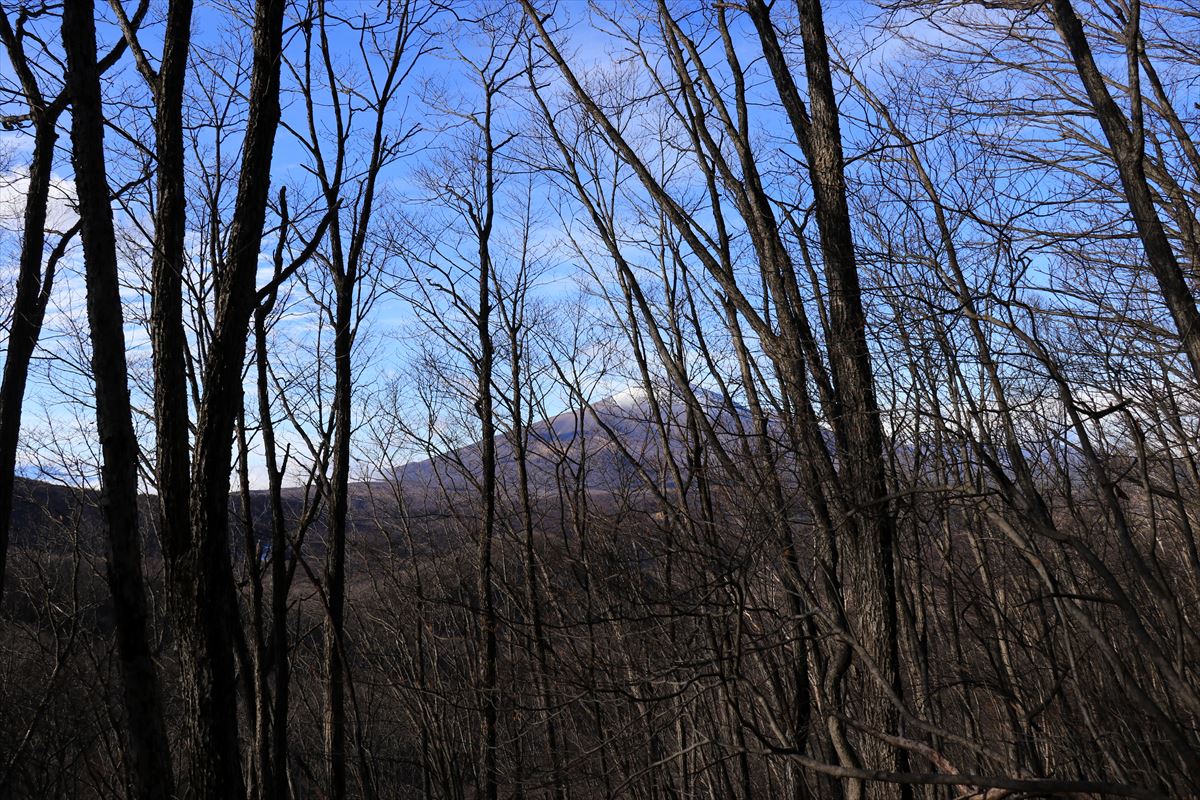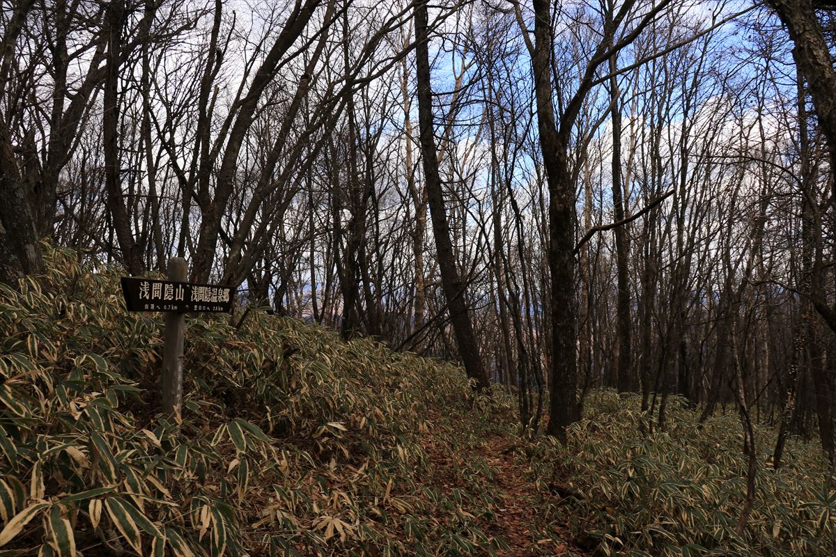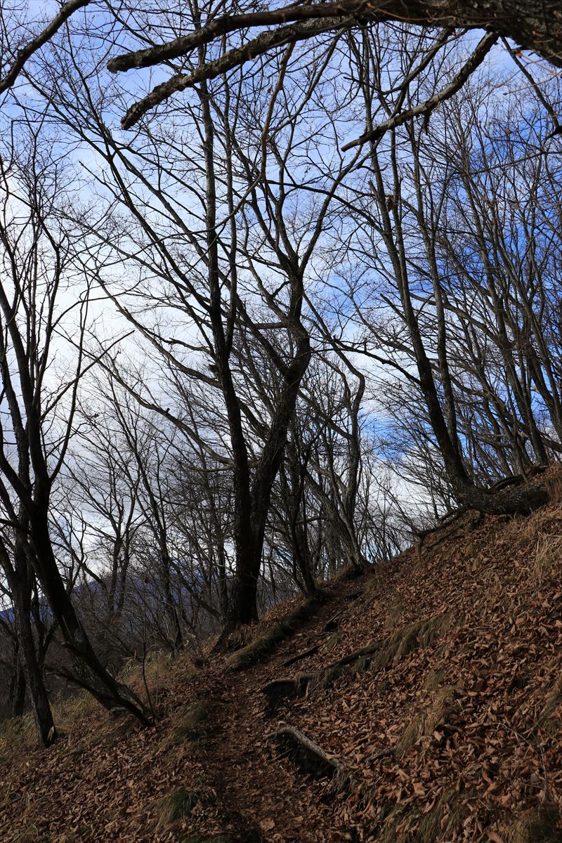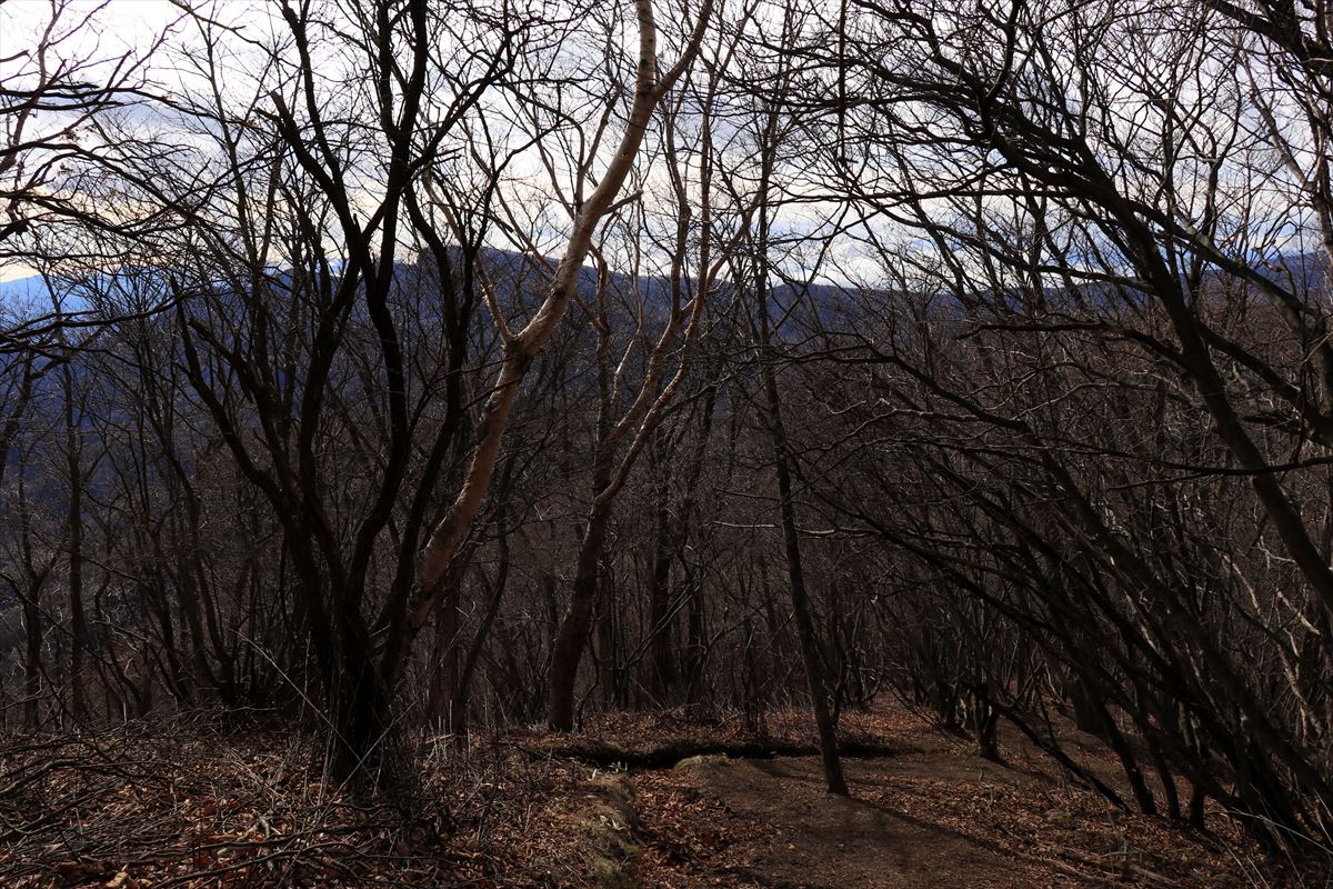 登り始めの急坂を越えると、以降暫くは起伏の少ない尾根のような所を歩いていく。樹間からは徐々に距離を詰めつつある浅間隠山が見えました。