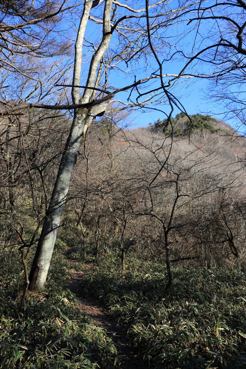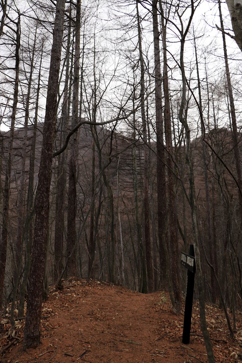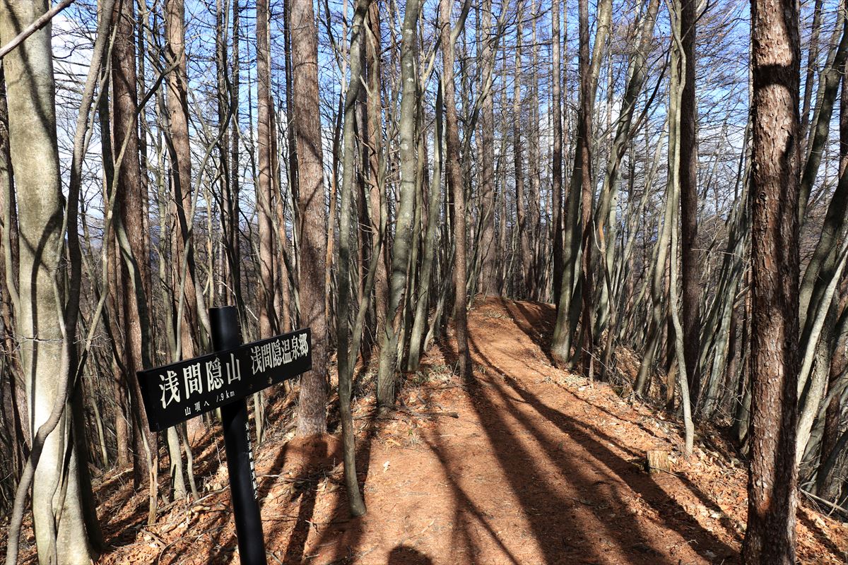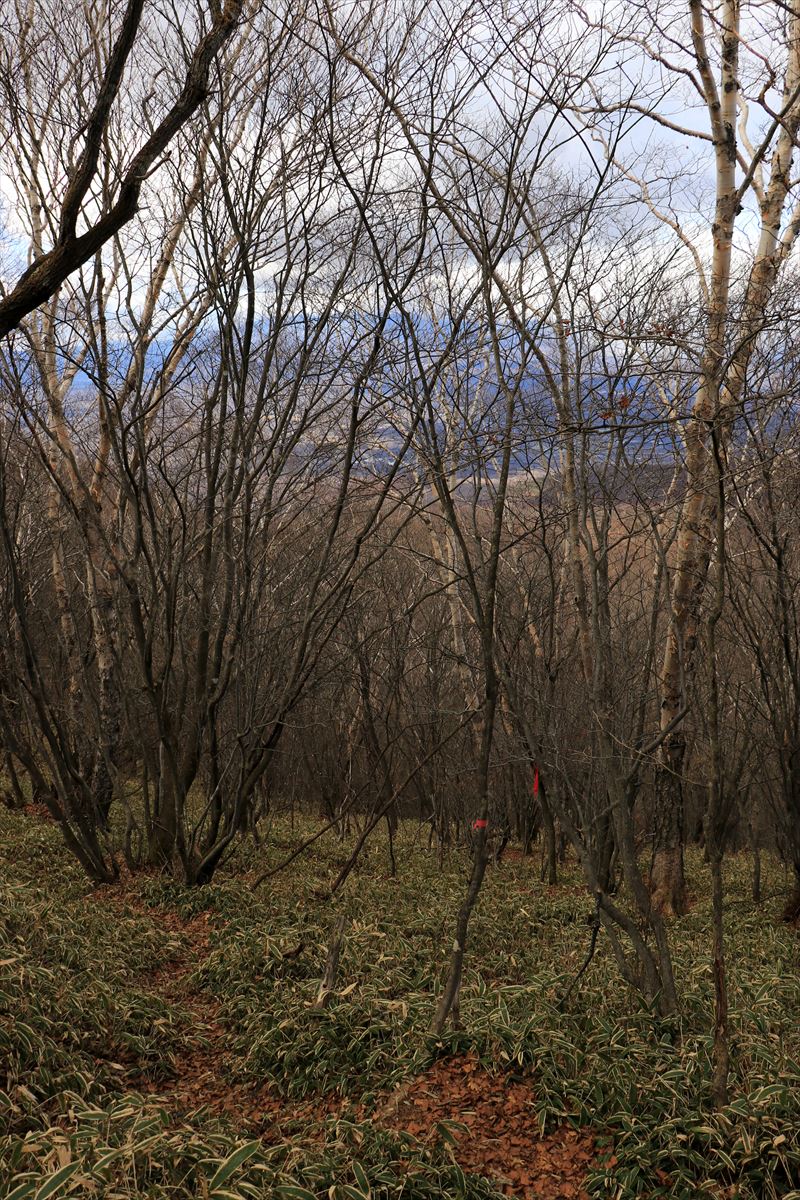 登り始めの急坂を越えると、以降暫くは起伏の少ない尾根のような所を歩いていく。樹間からは徐々に距離を詰めつつある浅間隠山が見えました。