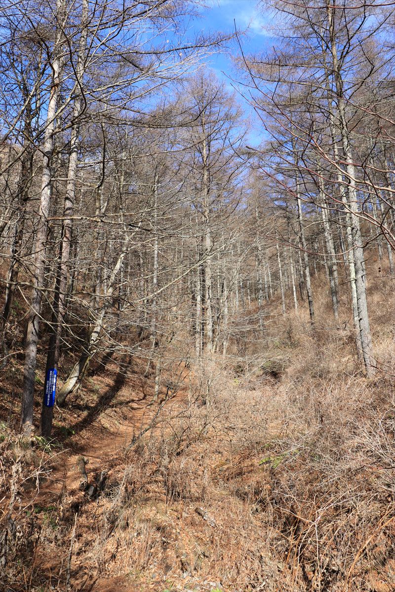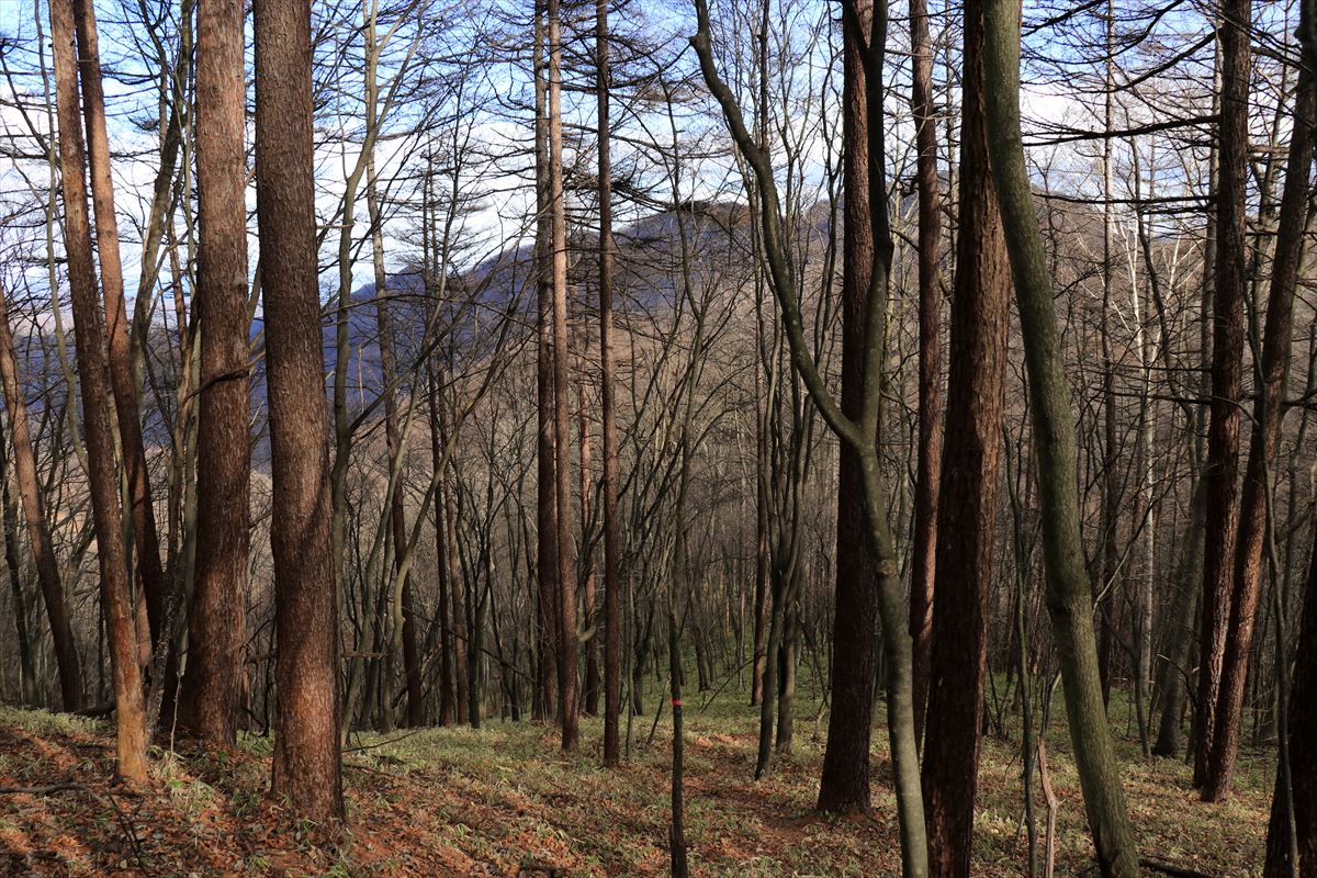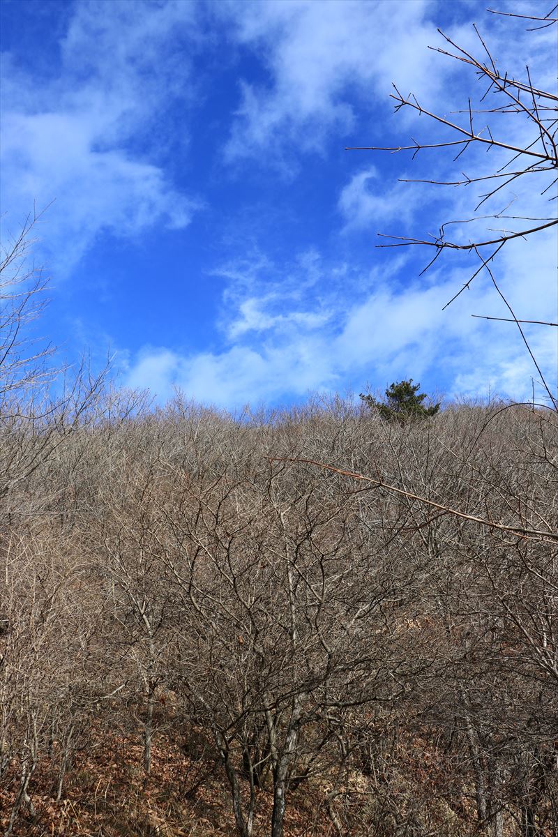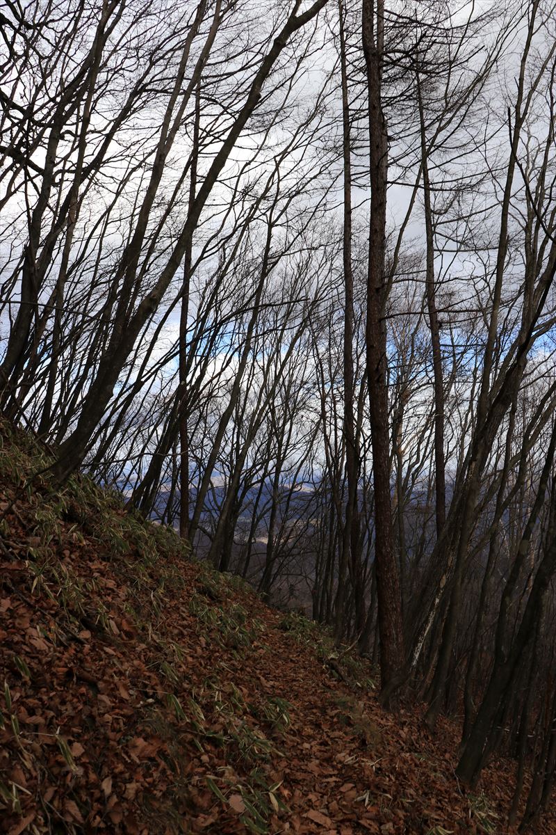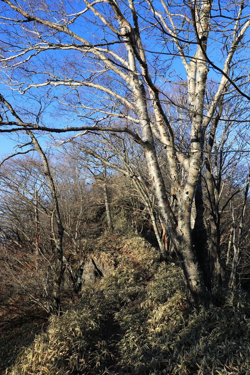 登り始めの急坂を越えると、以降暫くは起伏の少ない尾根のような所を歩いていく。樹間からは徐々に距離を詰めつつある浅間隠山が見えました。