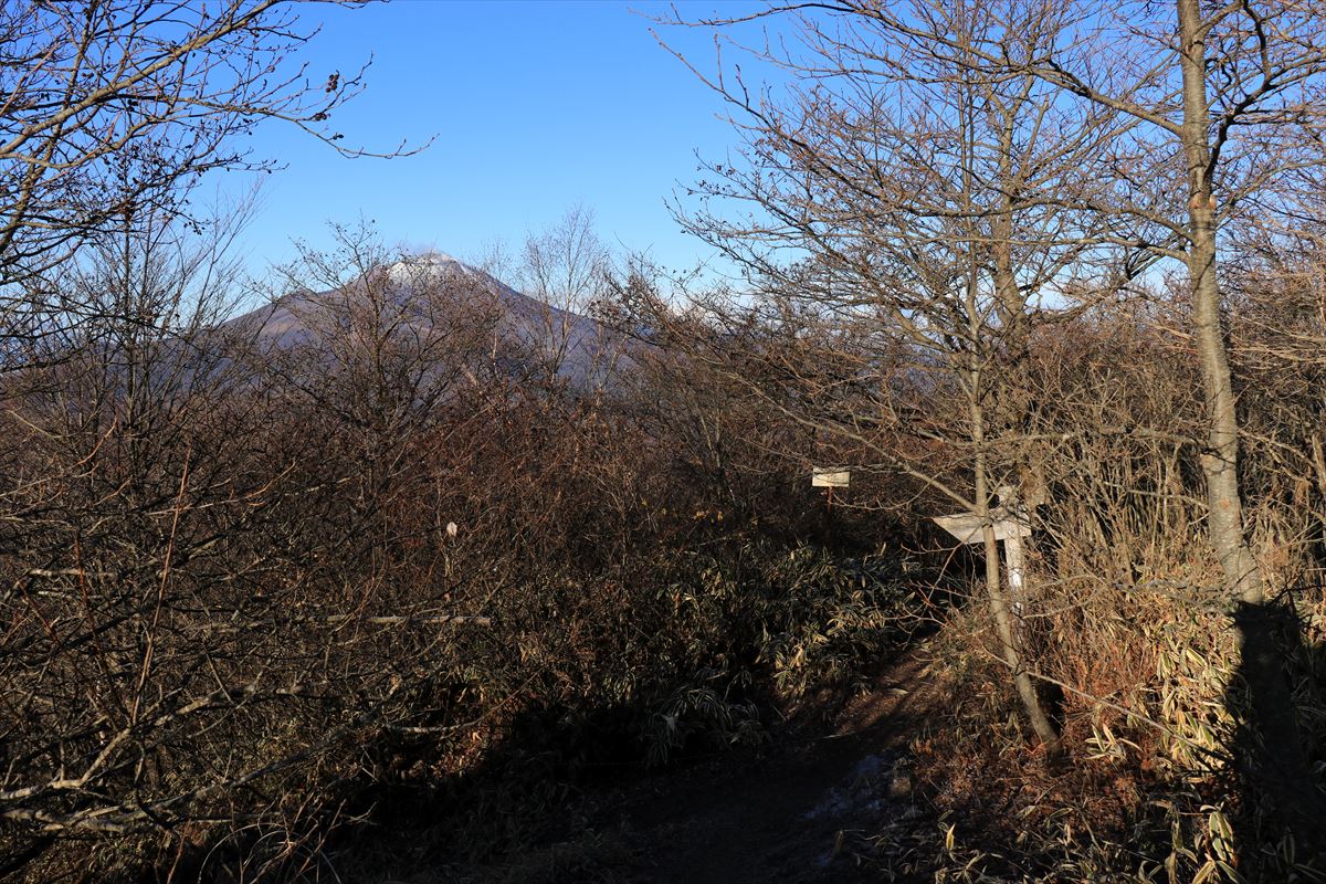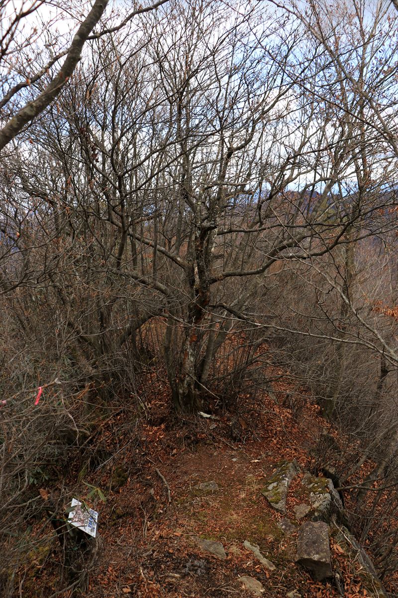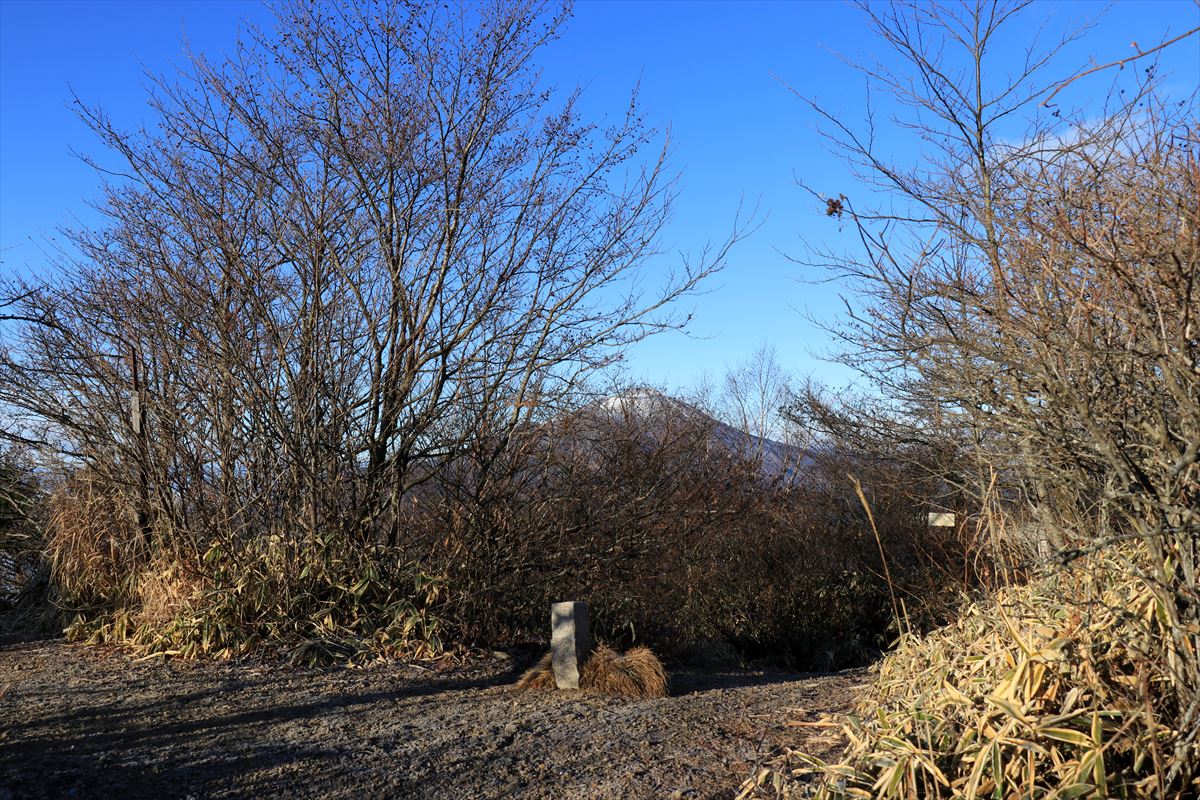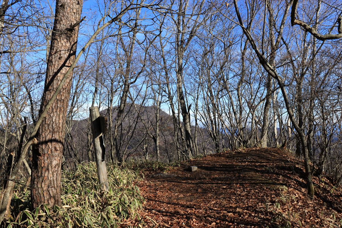 短い登り返しを終えて氷妻山に到着。全体的に枝木が生い茂っていて展望はありませんが、枝の間から浅間隠山が見えています。