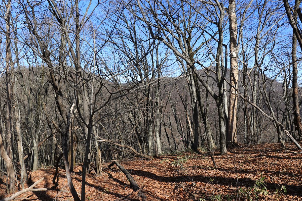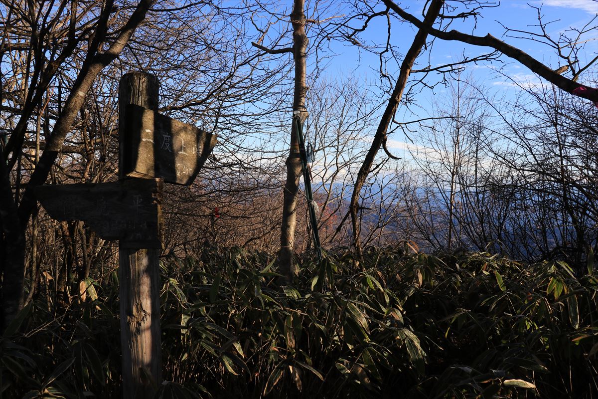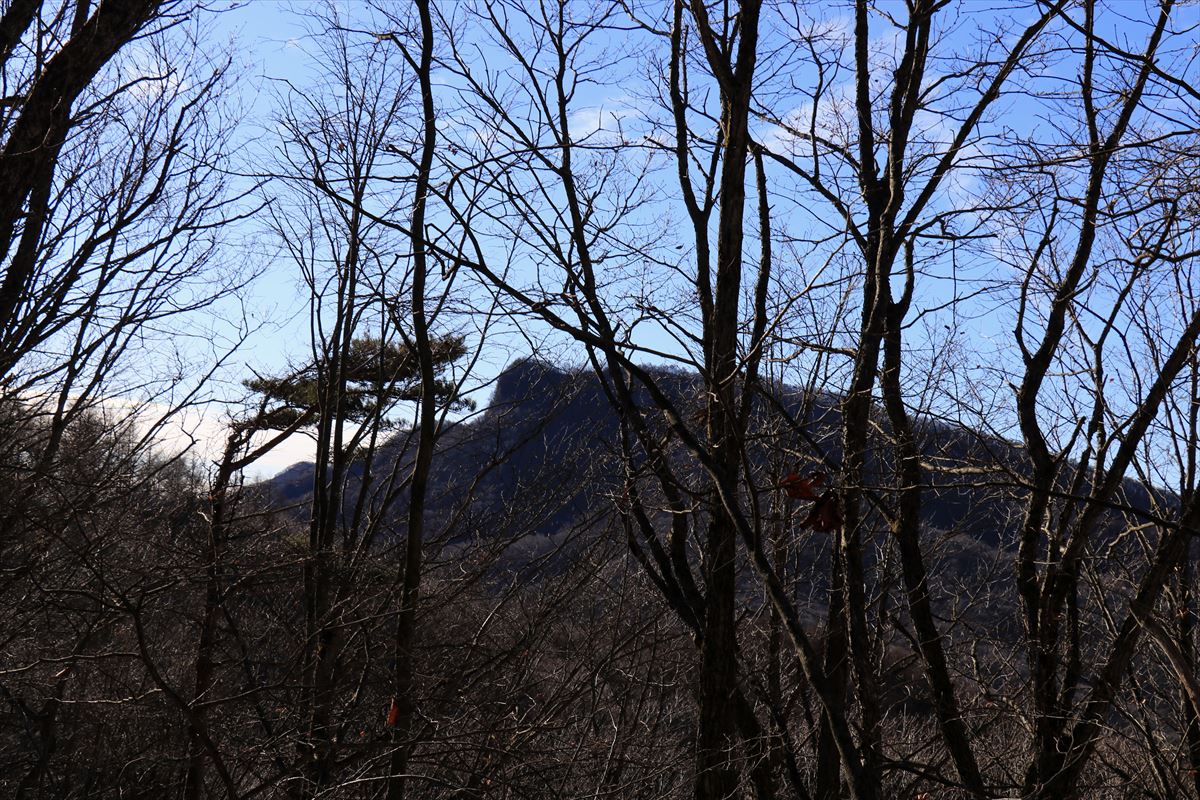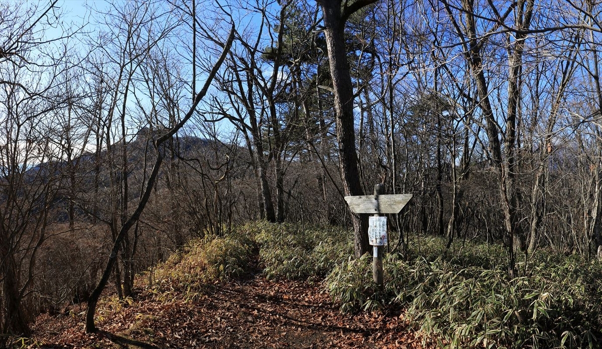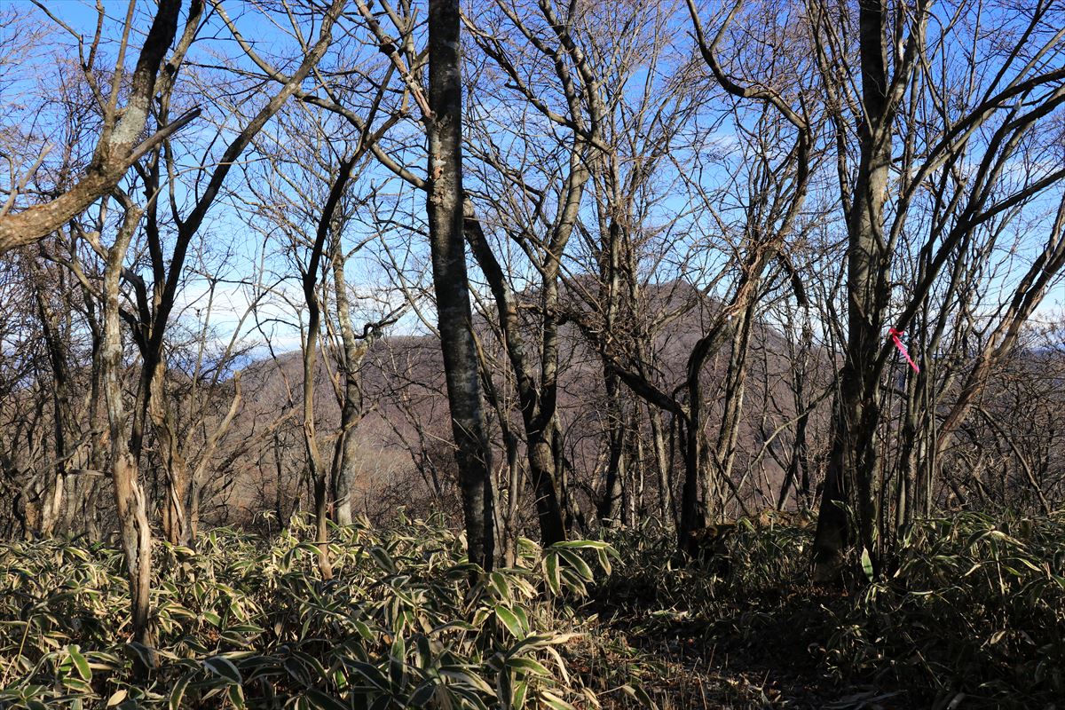 短い登り返しを終えて氷妻山に到着。全体的に枝木が生い茂っていて展望はありませんが、枝の間から浅間隠山が見えています。