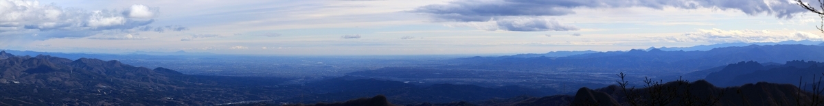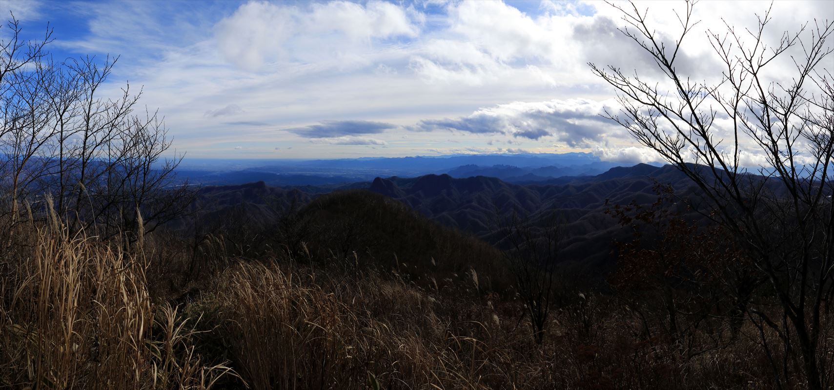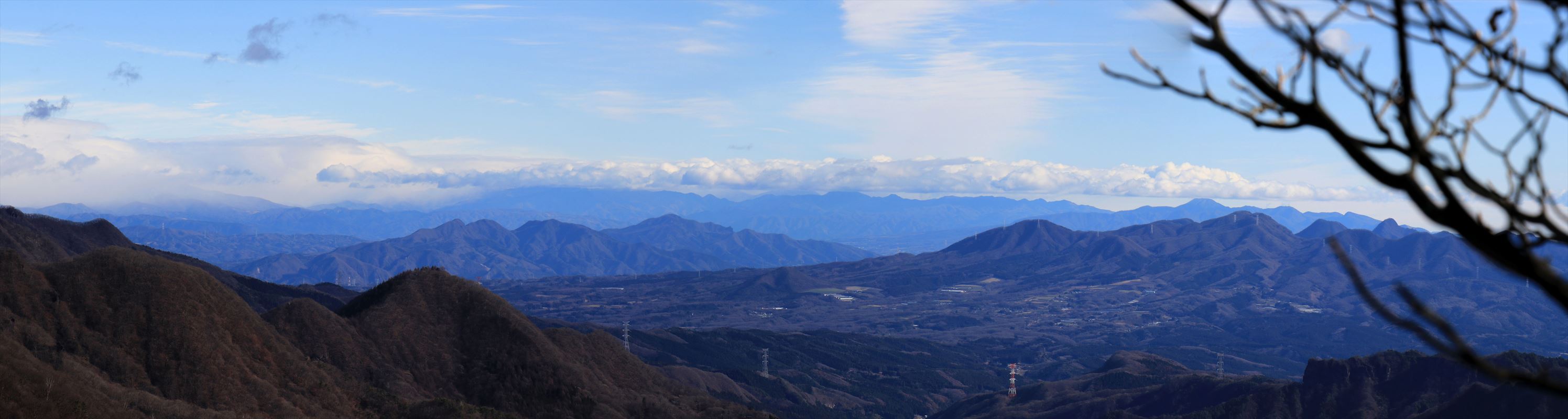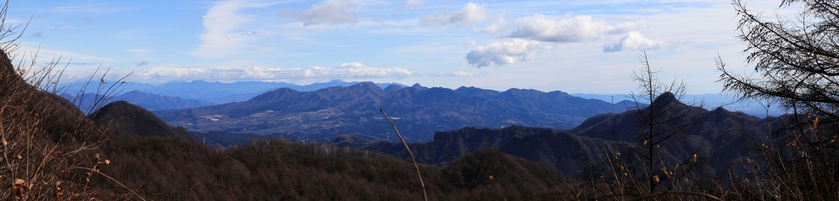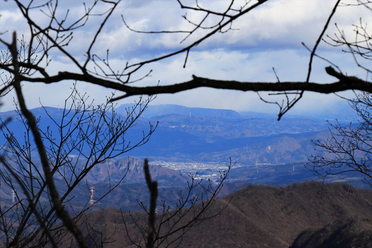 奥秩父山塊や関東平野方面。途中で木の枝が掛かっていますが、この日は主峰と言えるピークの殆どが見渡せました。