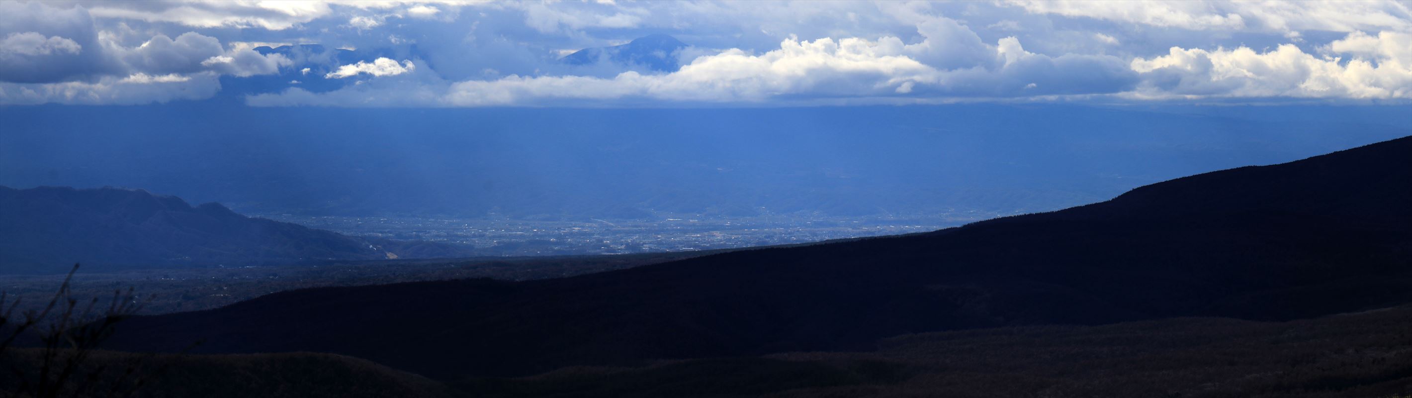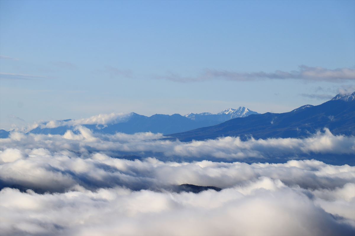 同方面の望遠。背後には蓼科山や北八ヶ岳らしき稜線も雲の間から僅かに見えていますね。
